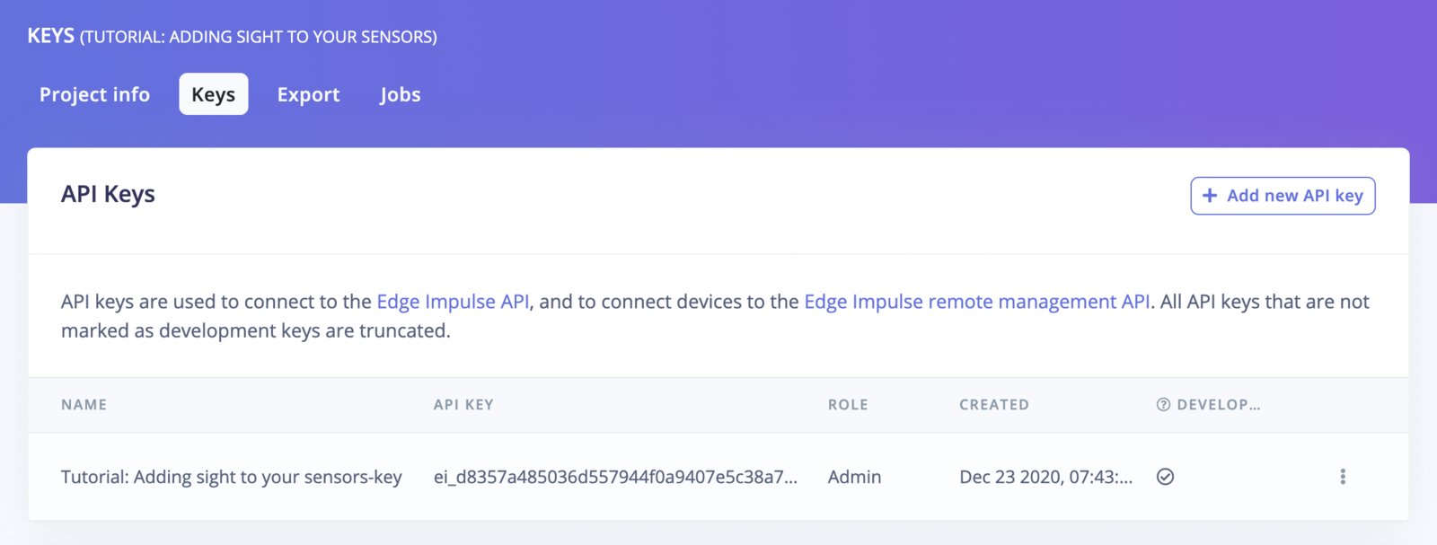 An Edge Impulse API key can be obtained through your Edge Impulse Studio project’s dashboard. At the top of the page, click on the Keys button to see your project’s available API keys, and to generate new keys.