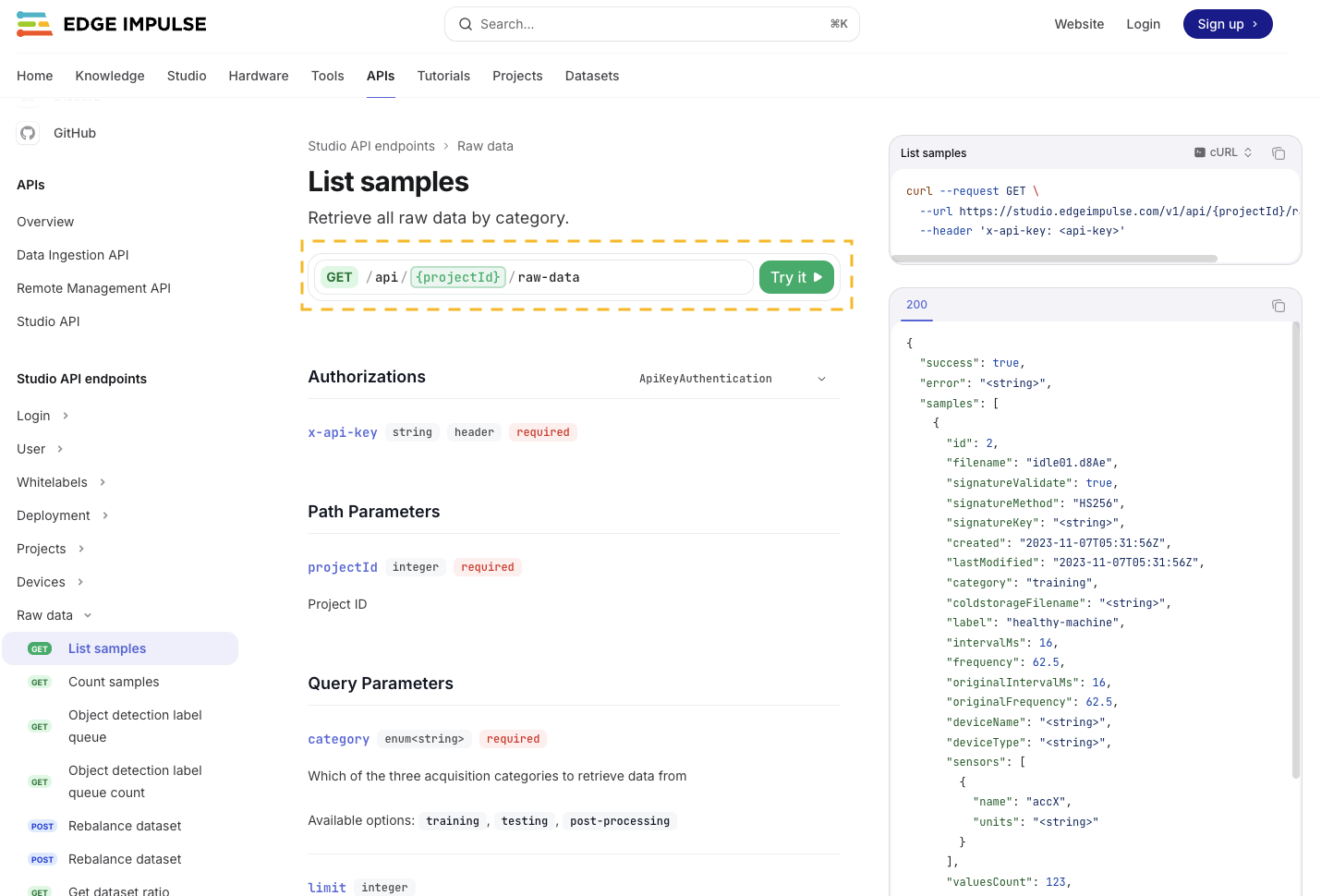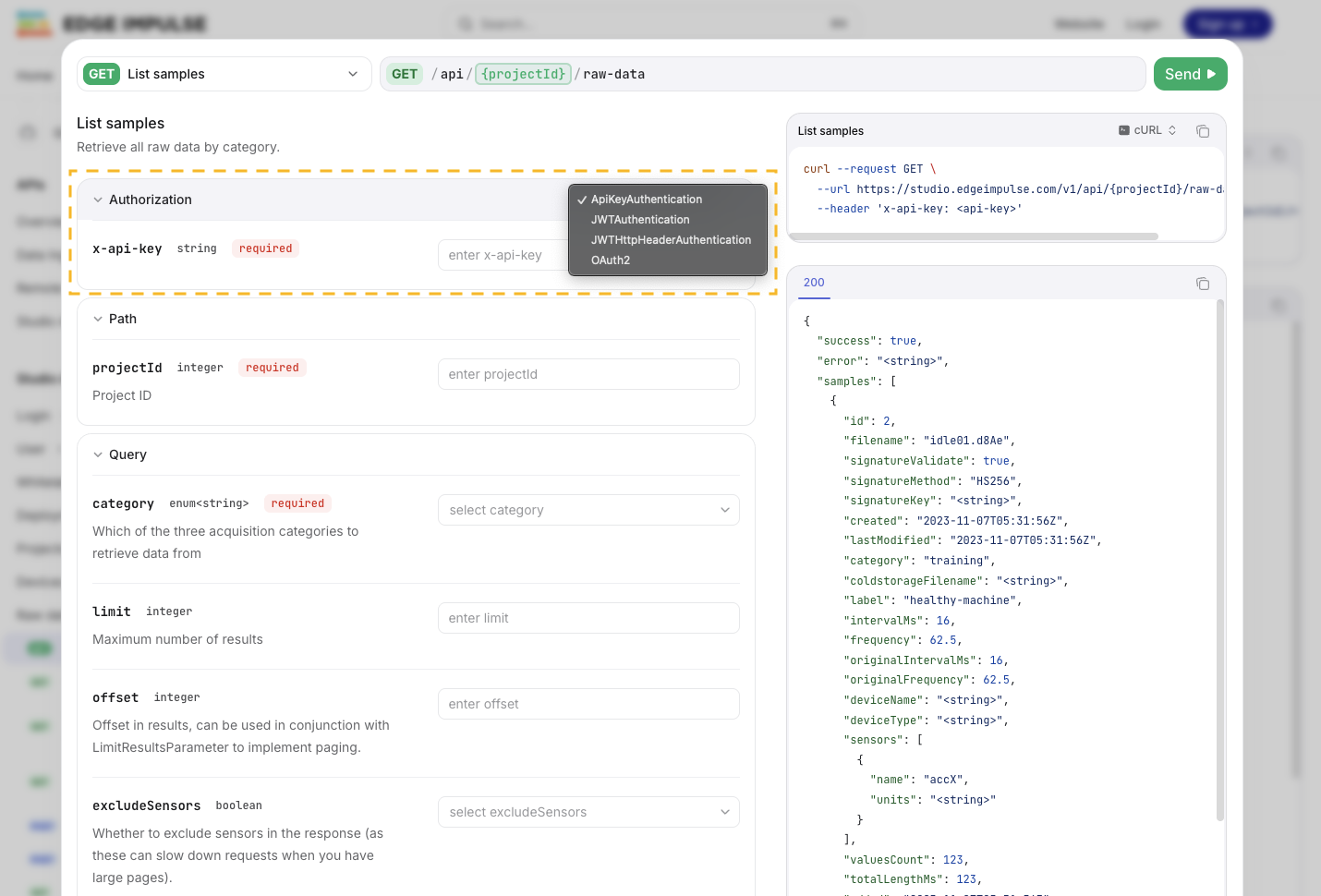 A JWT token can be acquired via the Edge Impulse API Get JWT token request with your Edge Impulse username and password. ExampleTest API requests