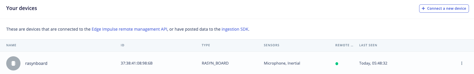 That’s all! Your device is now connected to Edge Impulse. To verify this, go to your Edge Impulse project, and click Devices. The device will be listed here.