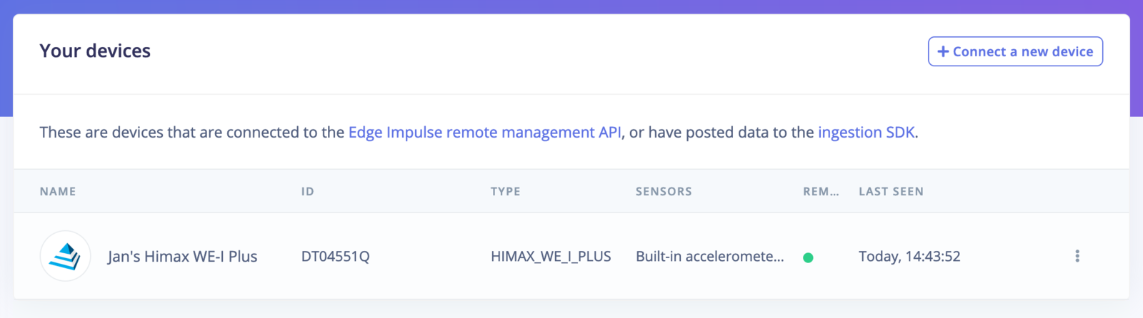 That’s all! Your device is now connected to Edge Impulse. To verify this, go to your Edge Impulse project, and click Devices. The device will be listed here.