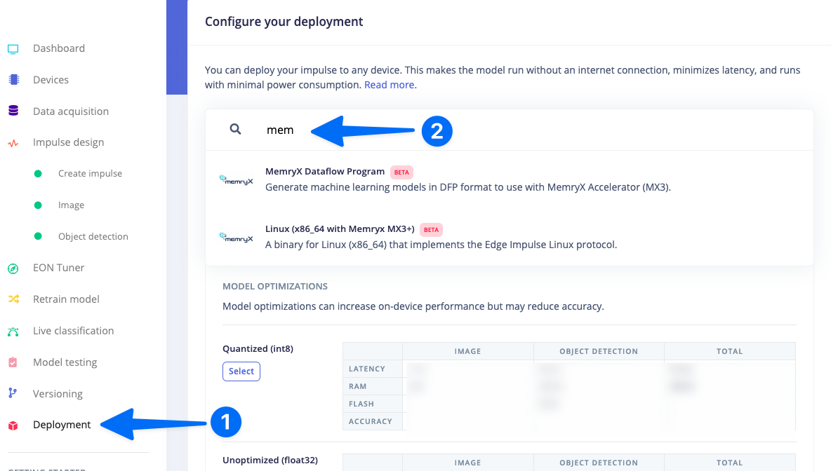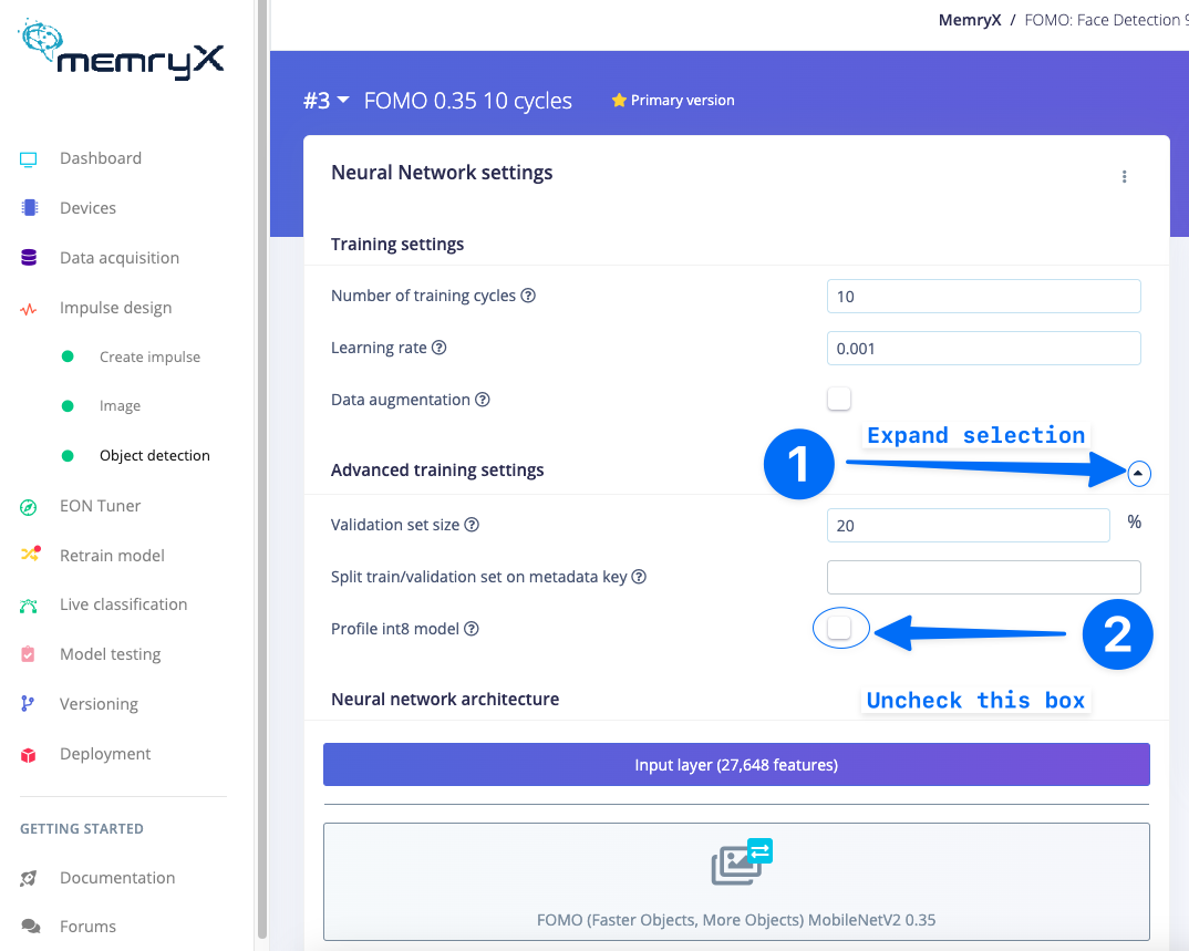 With everything set up you can now build your first machine learning model with these tutorials:No need to int8 modelMemryX devices only need a float32 model to be passed into the compiler. Therefore, when developing models with Edge Impulse it is better not to profile int8 (quantize) models. You may prevent generation, profiling, and deployment of int8 models by deselecting Profile int8 model under the Advanced training settings of your Impulse Design model training section.