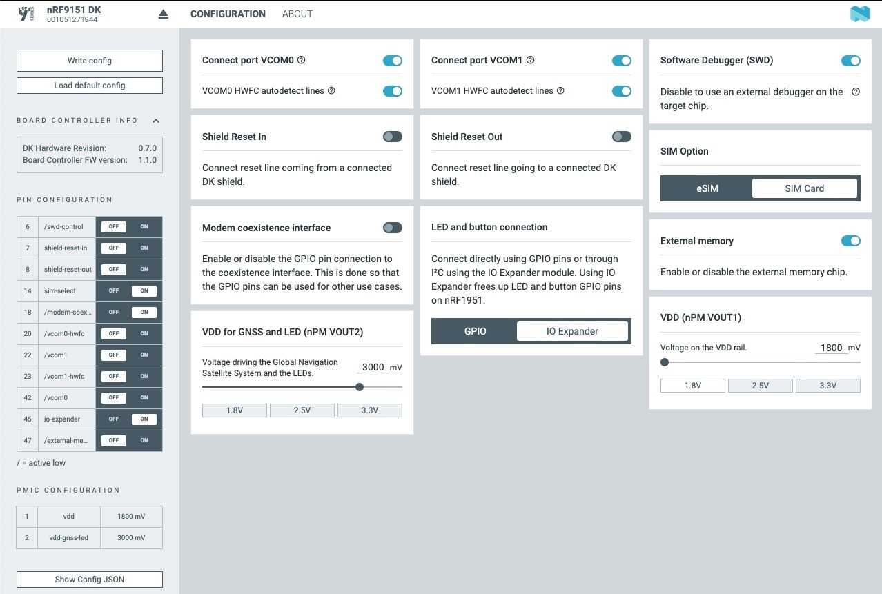 nRF9151 DK can be configured with Board Configurator tool that is inside nRF Connect for Desktop. All information on how this tool works and how to install it can be found in the document page. For our application the board need to have following configuration: