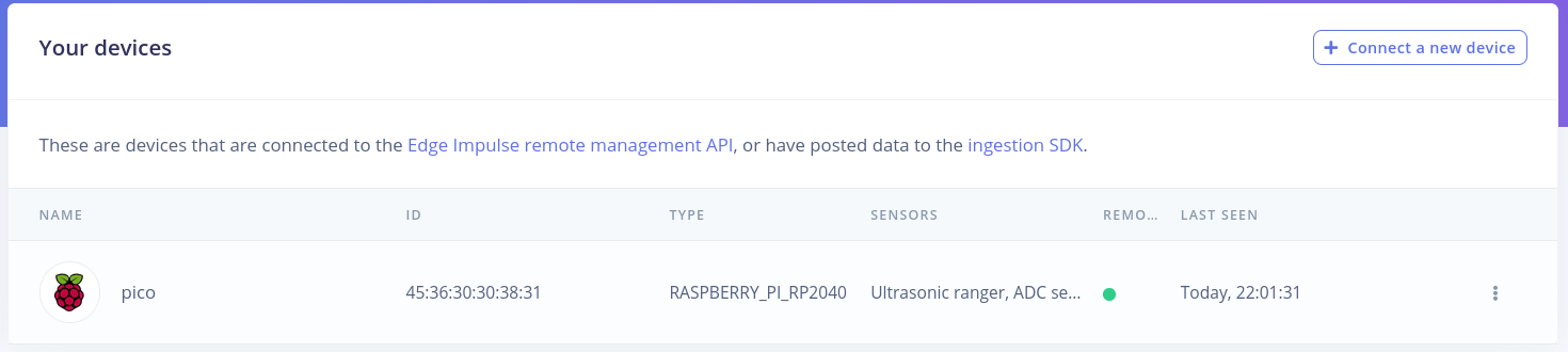With everything set up you can now build your first machine learning model. Since Raspberry Pi Pico does not have any built-in sensors, we decided to add the following ones to be supported out of the box, with a pre-built firmware:- Grove Ultrasonic Ranger (GP16; pin D16 on Grove Shield for Pi Pico).