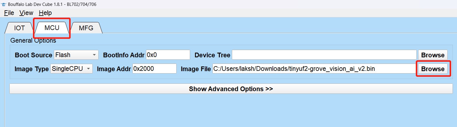Go to MCU tab. Under Image file, click Browse and select the firmware you just downloaded.