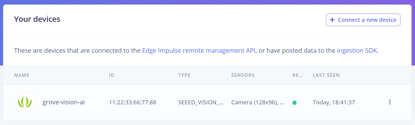 That’s all! Your device is now connected to Edge Impulse. To verify this, go to your Edge Impulse project, and click Devices. The device will be listed here.