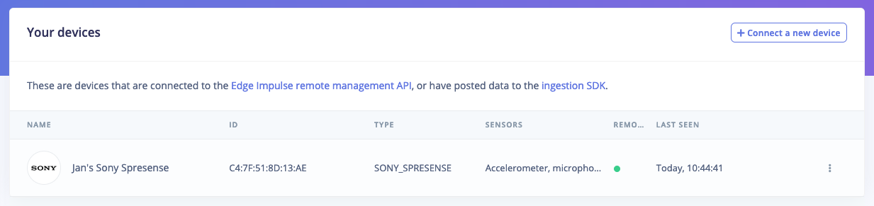 That’s all! Your device is now connected to Edge Impulse. To verify this, go to your Edge Impulse project, and click Devices. The device will be listed here.