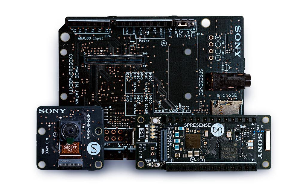 Spresense main board with attached camera, sensor add-on, Wi-Fi add-on, and extension board.