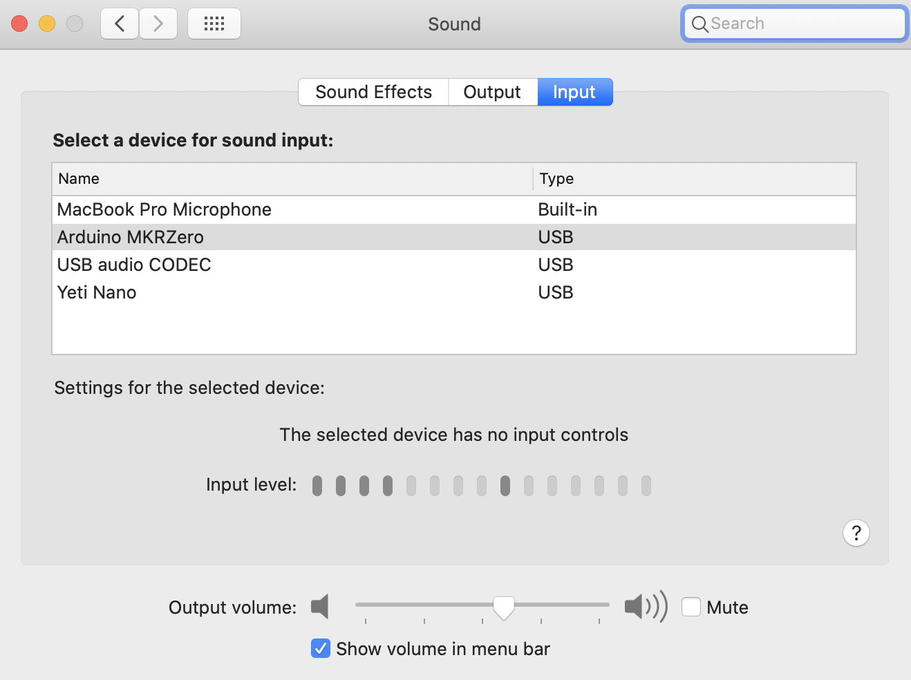 Audio - USB microphone (macOS/Linux only) Check that the Syntiant TinyML enumerates as “TinyML” or “Arduino MKRZero”. For example, in Mac OS you’ll find it under System Preferences/Sound: