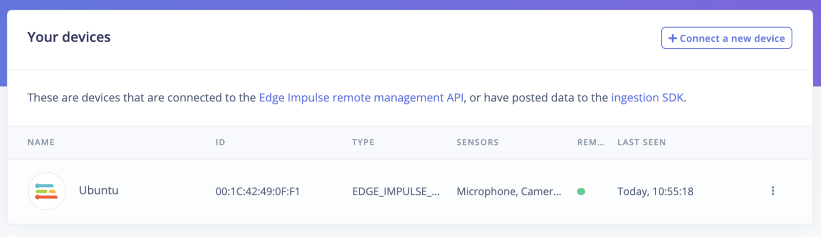 That’s all! Your machine is now connected to Edge Impulse. To verify this, go to your Edge Impulse project, and click Devices. The device will be listed here.
