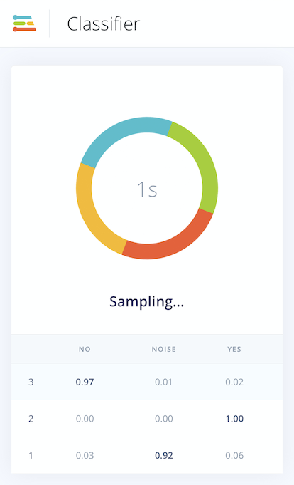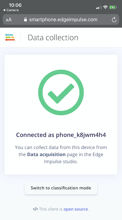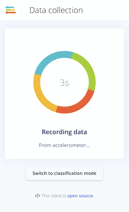 With the impulse designed, trained and verified you can deploy this model back to your phone. This makes the model run without an internet connection, minimizes latency, and runs with minimum power consumption. Edge Impulse can package up the complete impulse - including the signal processing code, neural network weights, and classification code - up in a single WebAssembly package that you can straight from the browser. To do so, just click Switch to classification mode at the bottom of the mobile client. This will first build the impulse, and then samples data from the sensor, run the signal processing code, and then classify the data: