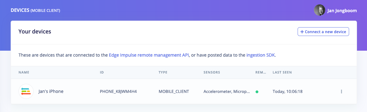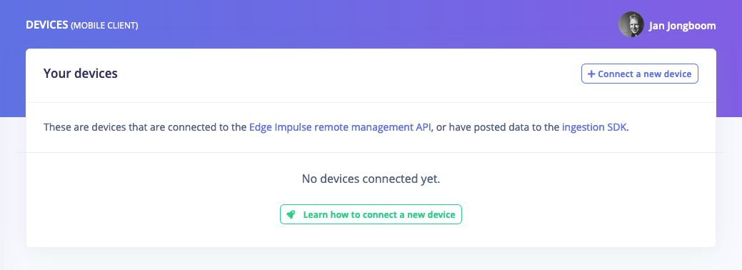 To connect your mobile phone to Edge Impulse, go to your Edge Impulse project, and head to the Devices page. Then click Connect a new device.