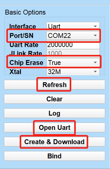 Click Refresh, choose the Port related to the connected A1101, set Chip Erase to True, click Open UART, click Create & Download and wait for the process to be completed .
