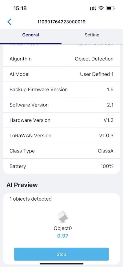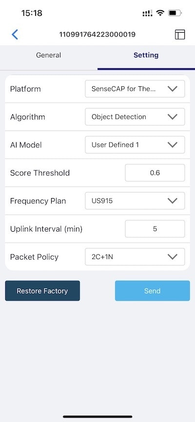 Click Setup and it will start scanning for nearby SenseCAP A1101 devices- Go to Settings and make sure Object Detection and User Defined 1 is selected. If not, select it and click Send