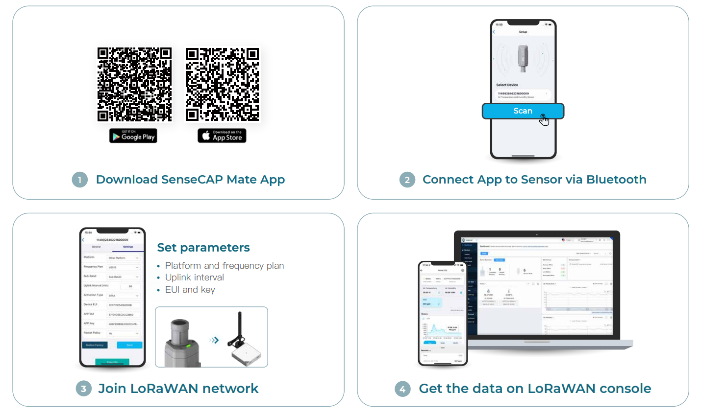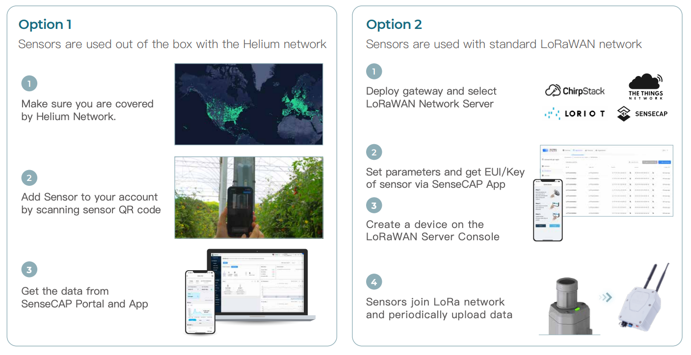 LoRaWAN® network coverage is required when using sensors, there are two options.