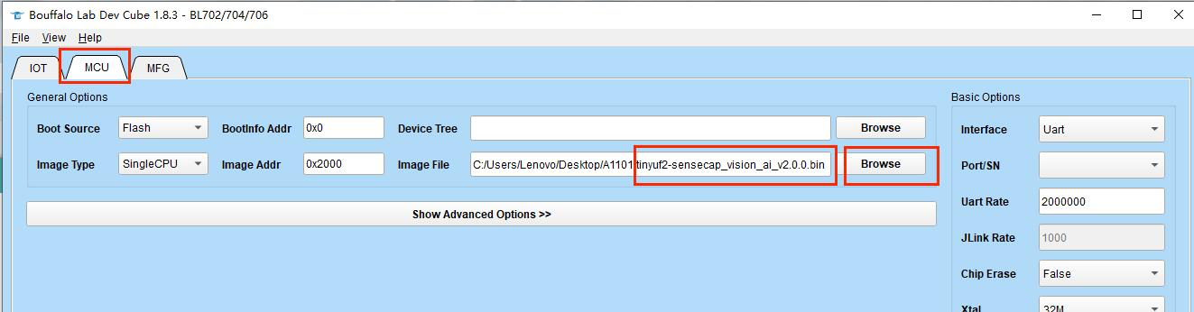 Go to the MCU tab. Under Image file, click Browse and select the firmware you just downloaded.