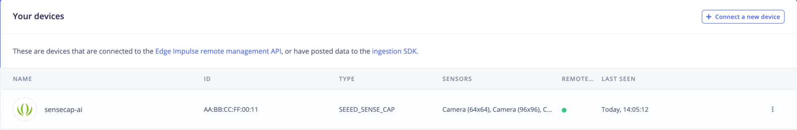 That’s all! Your device is now connected to Edge Impulse. To verify this, go to your Edge Impulse project, and click Devices. The device will be listed here.