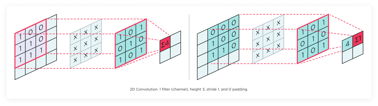The 2D convolution layer is used primarily for image data and other two-dimensional input (like spectrograms). This layer operates with filters that move across the input image’s height and width to detect patterns like edges, corners, or textures. Each filter produces a 2D activation map that represents the locations and strength of detected features in the input.