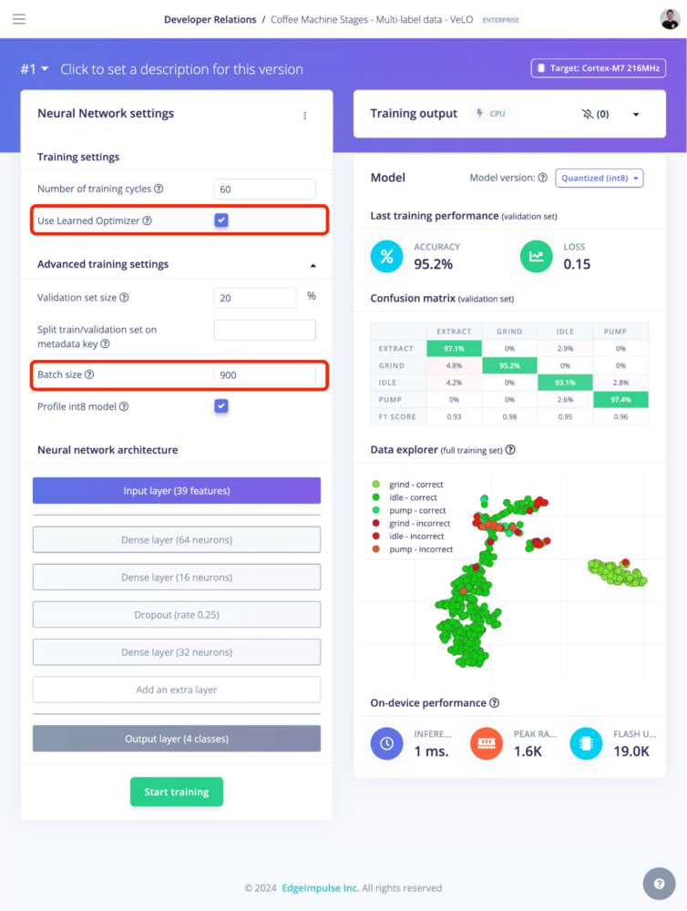 The Learned Optimizer can be enabled in Edge Impulse as an option on the training page.