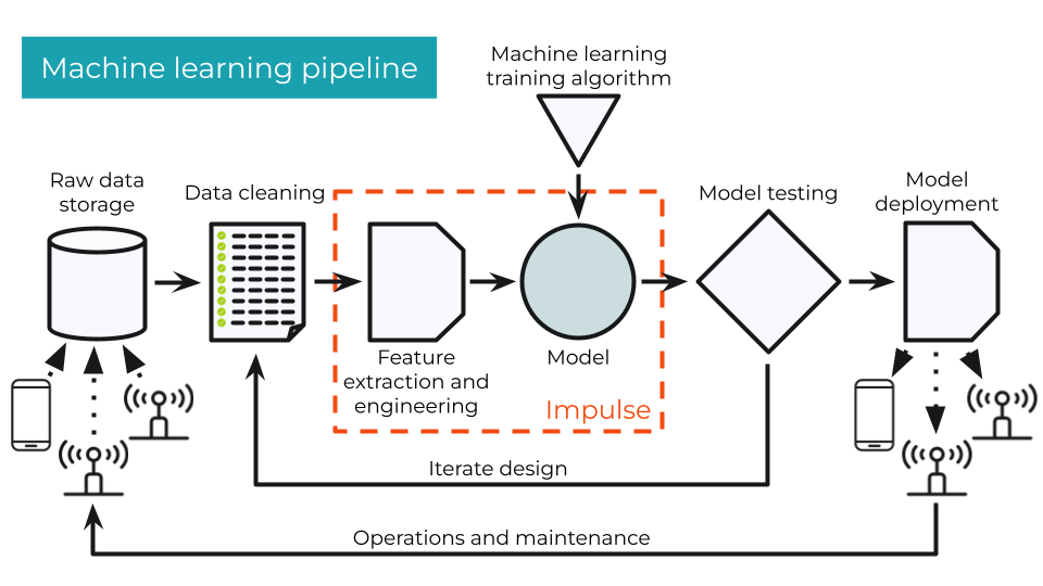 To start the process, you need to collect raw data. For most deep learning models, you need a lot of data (think thousands or tens of thousands of samples). In many cases, data collection involves deploying sensors to the field or your target environment and let them collect raw data. You might collect audio data with a smartphone or vibration data using an IoT sensor. You can create custom software that automatically transmits the data to a data lake or store it directly to an Edge Impulse project. Alternatively, you can store data directly to the device, such as on an SD card, that you later upload to your data storage. Examples of data can include raw time-series data in a CSV file, audio saved as a WAV file, or images in JPEG format. Note that sensors can vary. As a result, it’s usually a good idea to collect data using the same device and/or sensors that you plan to ultimately deploy to. For example, if you plan to deploy your ML model to a smartphone, you likely want to collect data using smartphones.Data cleaning