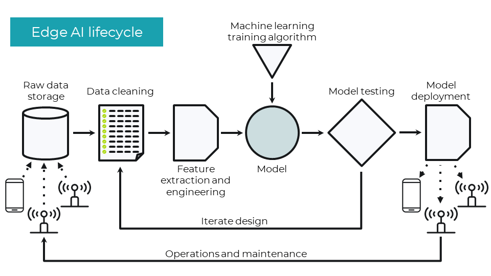 The edge AI lifecycle consists of the steps required to collect data, clean that data, extract required features, train one or more ML models, test the model, deploy the model, and perform necessary maintenance. Note that these steps do not include some of the larger project processes of identifying business needs and creating the application around the model.