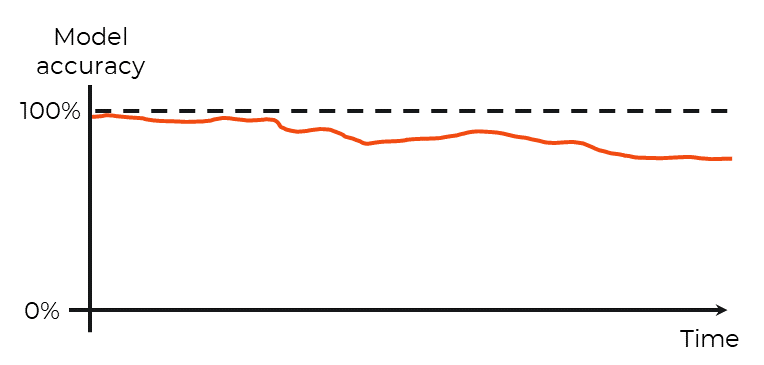 Model drift occurs when an ML model’s loses accuracy over time. This can happen over the course of days or years.
