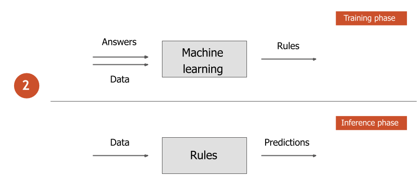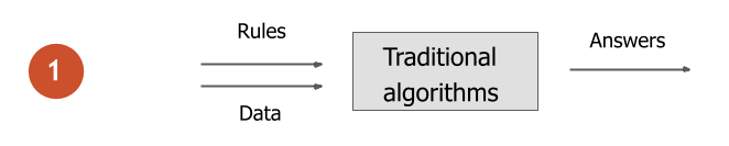 When developing traditional algorithms, the parameters and rules of the system are designed by a human. Such algorithms accept data as input and produce results.