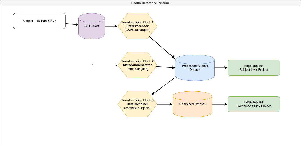 The dataset selected to use in this example is the PPG-DaLiA dataset, which includes 15 subjects performing 9 activities, resulting in a total of 15 recordings. See the CSV file summary here, and read more about it in the publishers website here, This dataset covers an activity study where data is recorded from a wearable end device (PPG + accelerometer), along with labels such as Stairs, Soccer, Cycling, Driving, Lunch, Walking, Working, Clean Baseline, and No Activity. The data is collected and validated, then written to a clinical dataset in an Edge Impulse organization, and finally imported into an Edge Impulse project where we train a classifier. The health reference design builds transformation blocks that sync clinical data, validate the dataset, query the dataset, and transform the data to process raw data files into a unified dataset.