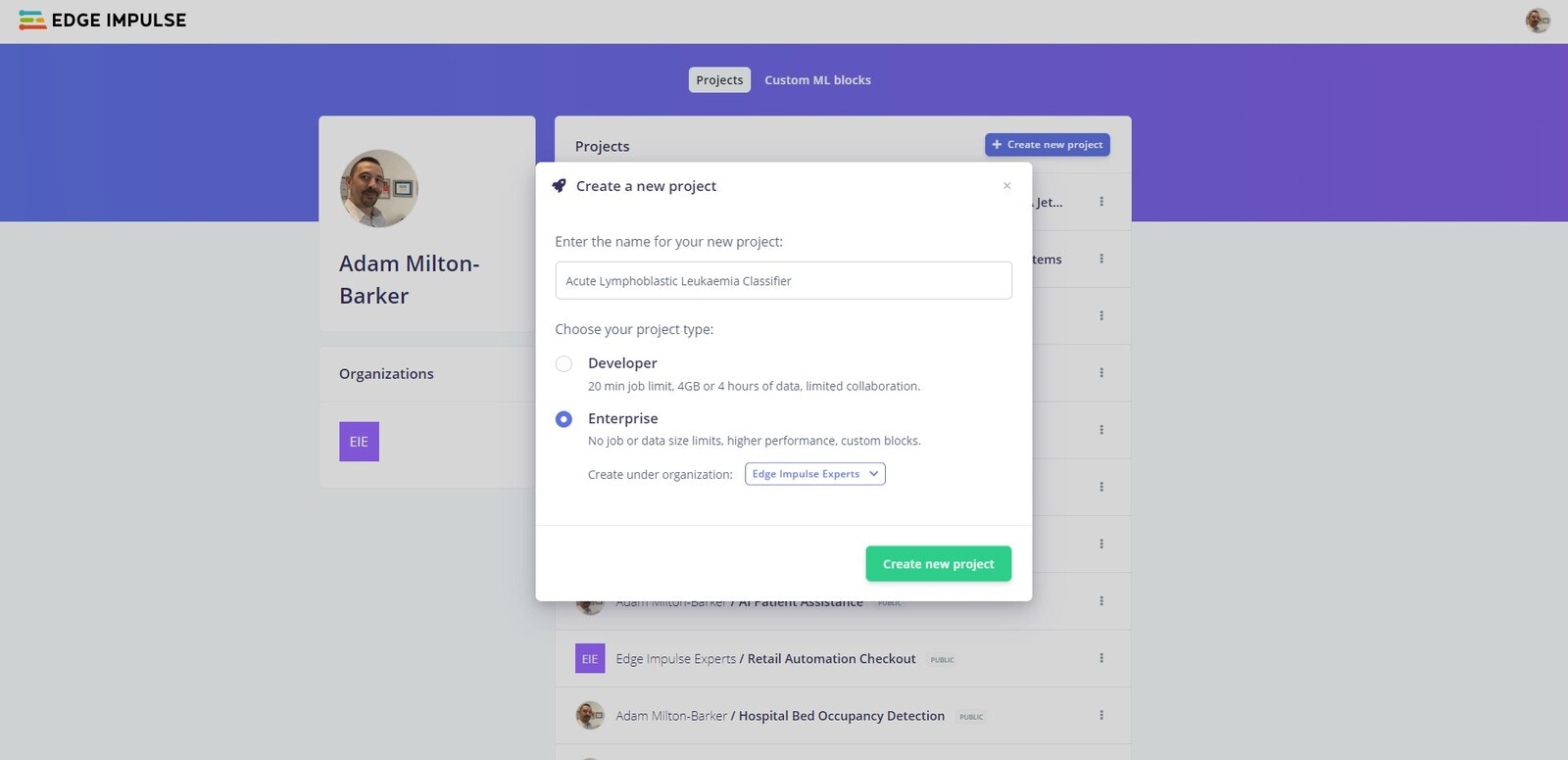 Getting started is as simple as heading to Edge Impulse and create your account or login. Once logged in you will be taken to the project selection/creation page.Create New Project