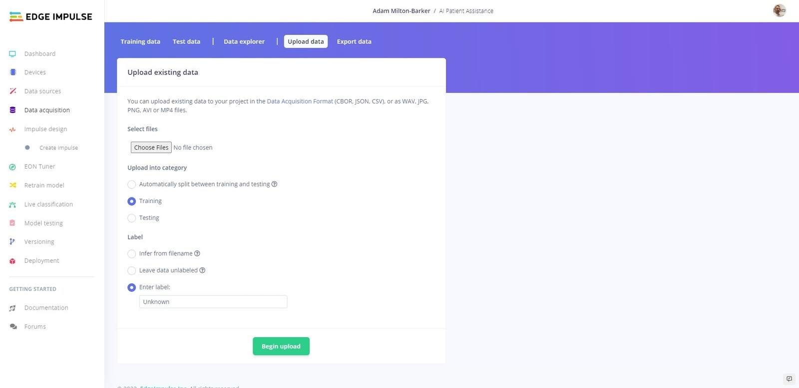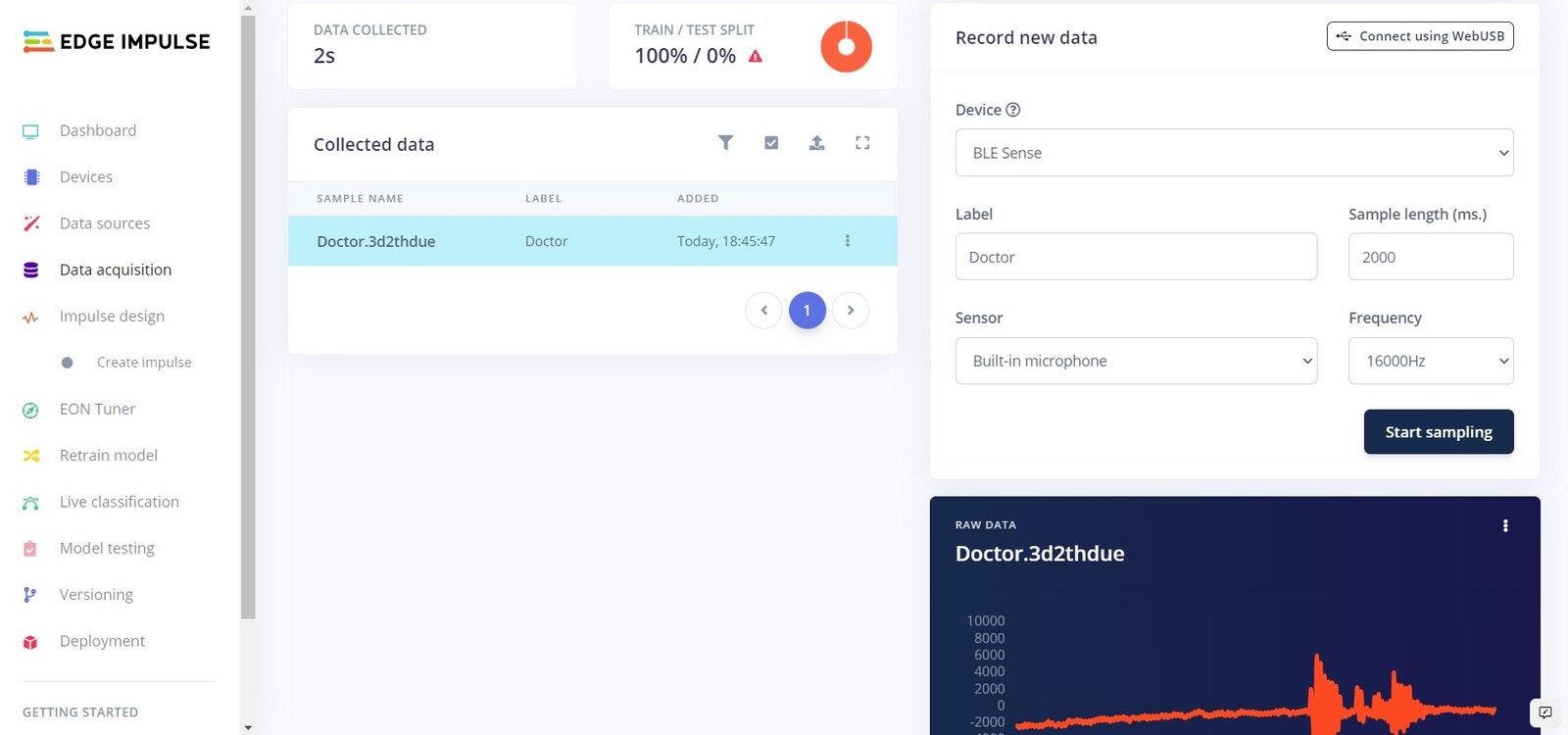 We are going to create our own dataset, using the built in microphone on the Arduino Nano 33 BLE Sense. We are going to collect data that will allow us to train a machine learning model that can detect the words/phrases Doctor, Nurse, and Help. We will use the Record new data feature on Edge Impulse to record 15 sets of 10 utterances of each of our keywords, and then we will split them into individual samples. Ensuring your device is connected to the Edge Impulse platform, head over to the Data Acquisition tab to continue.