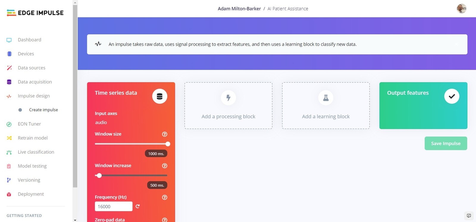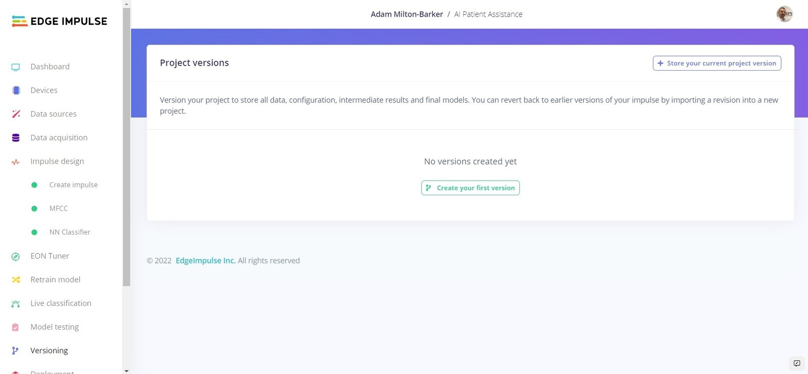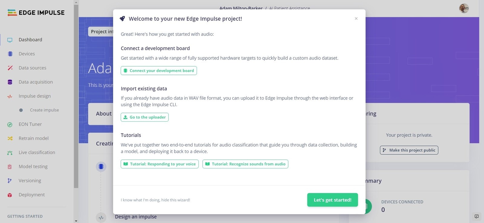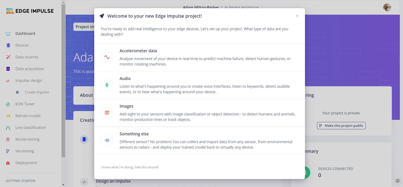 Head over to Edge Impulse and create your account or login. Once logged in you will be taken to the project selection/creation page.Create New Project
