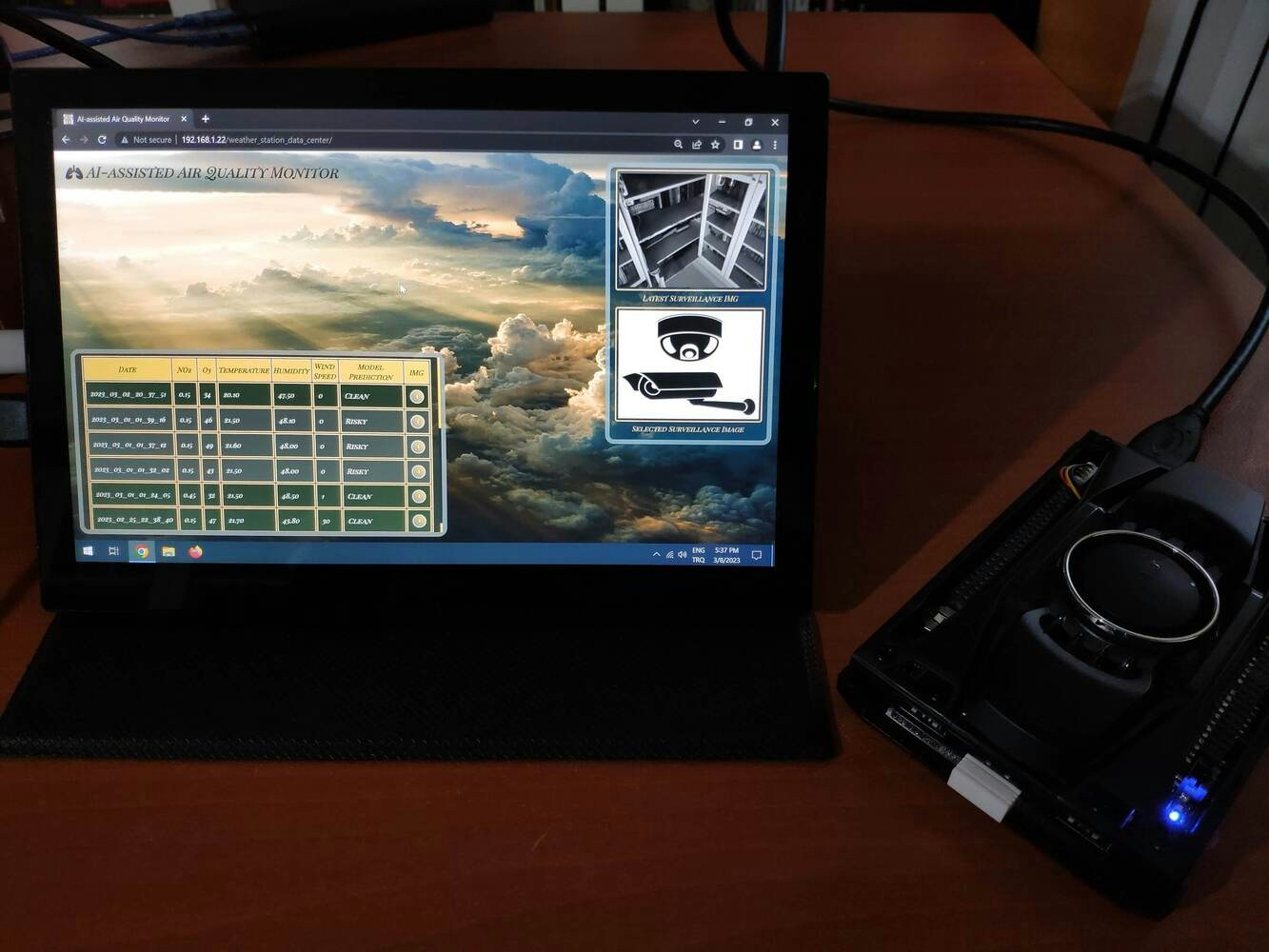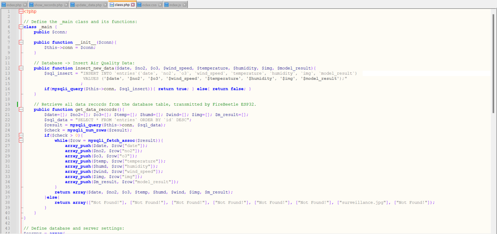 To provide an exceptional user experience for this AIoT air station, I developed a full-fledged web application from scratch in PHP, HTML, JavaScript, CSS, and MySQL. This web application obtains the collected air quality data, the detected air pollution level (class) by the neural network model, and the captured surveillance footage from FireBeetle ESP32 via an HTTP POST request. After saving the received information to the MySQL database table for further inspection, the web application converts the received raw image data to a JPG file via a Python script. Then, the web application updates itself automatically to show the latest received information and surveillance footage. Also, the application displays all stored air quality data with model detection results in descending order and allows the user to inspect previous surveillance footage. As shown below, the web application consists of three folders and seven code files:- /assets