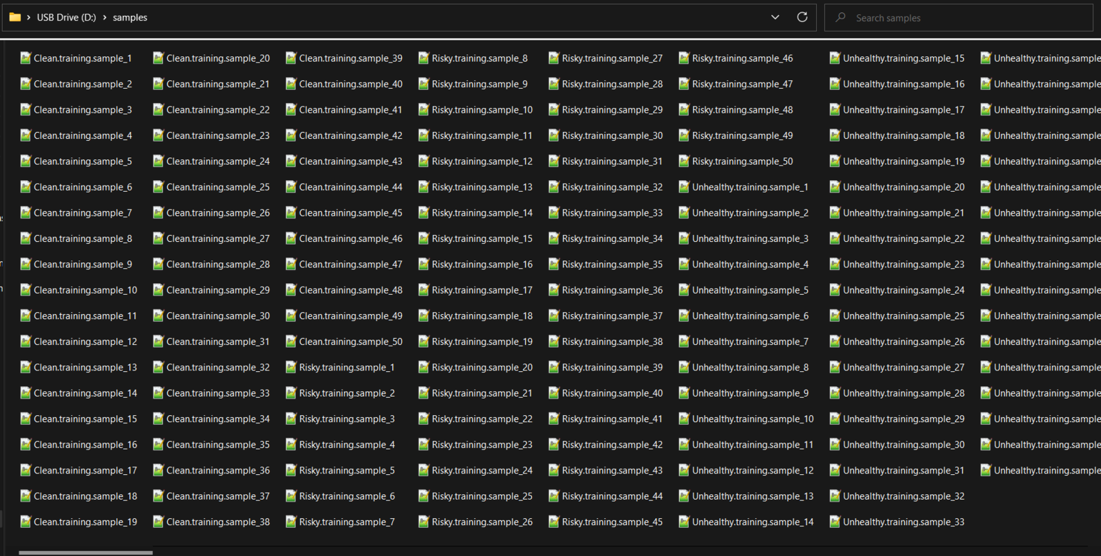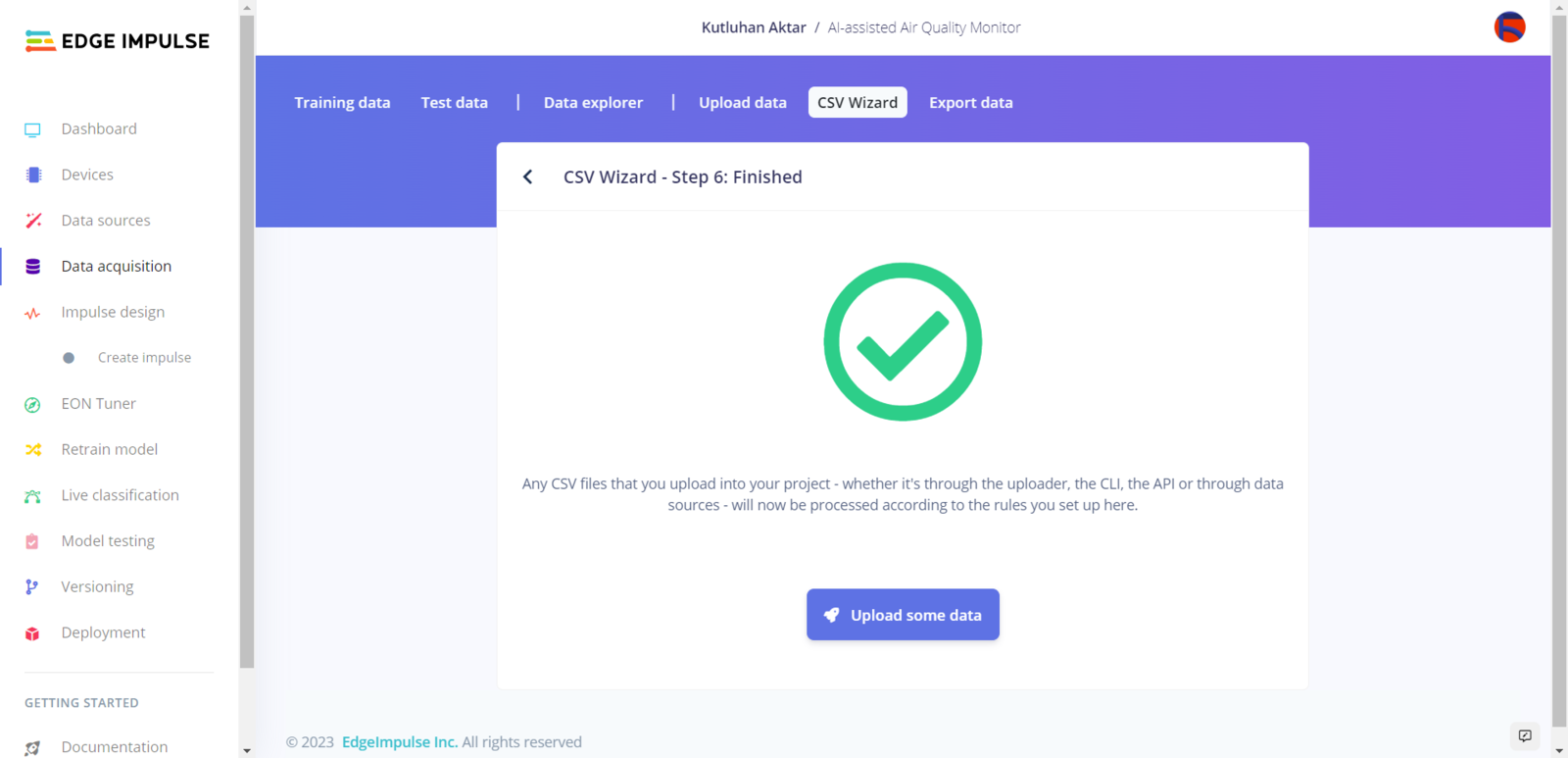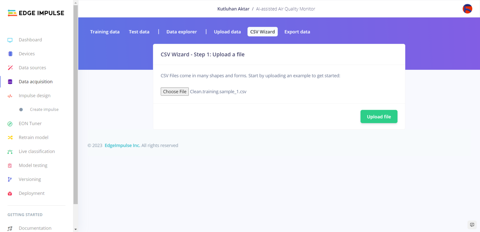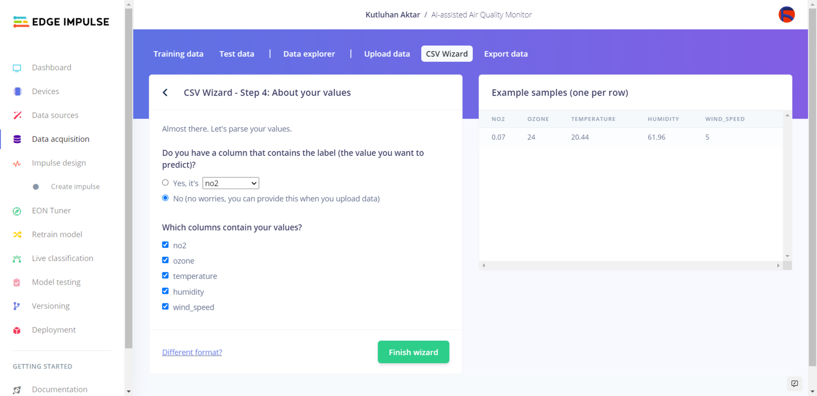 As long as the CSV file includes a header defining data fields, Edge Impulse can distinguish data records as individual samples in different data structures thanks to its CSV Wizard while adding existing data to an Edge Impulse project. Therefore, there is no need for preprocessing single CSV file data sets even if the data type is not time series. Since Edge Impulse can infer the uploaded sample’s label from its file name, I employed FireBeetle ESP32 to create a new CSV file for each data record and name the generated files by combining the given air pollution level and the sample number incremented by 1 for each class (label) automatically.- Clean.training.sample_1.csv