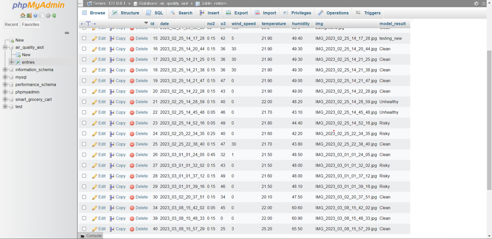 After setting the web application on LattePanda 3 Delta 864: 🎈⚠️📲 The web application (update_data.php) saves the information transferred by FireBeetle ESP32 via an HTTP POST request with URL query parameters to the given MySQL database table. /update_data.php?no2=0.15&o3=25&temperature=25.20&humidity=65.50&wind_speed=3&model_result=Clean