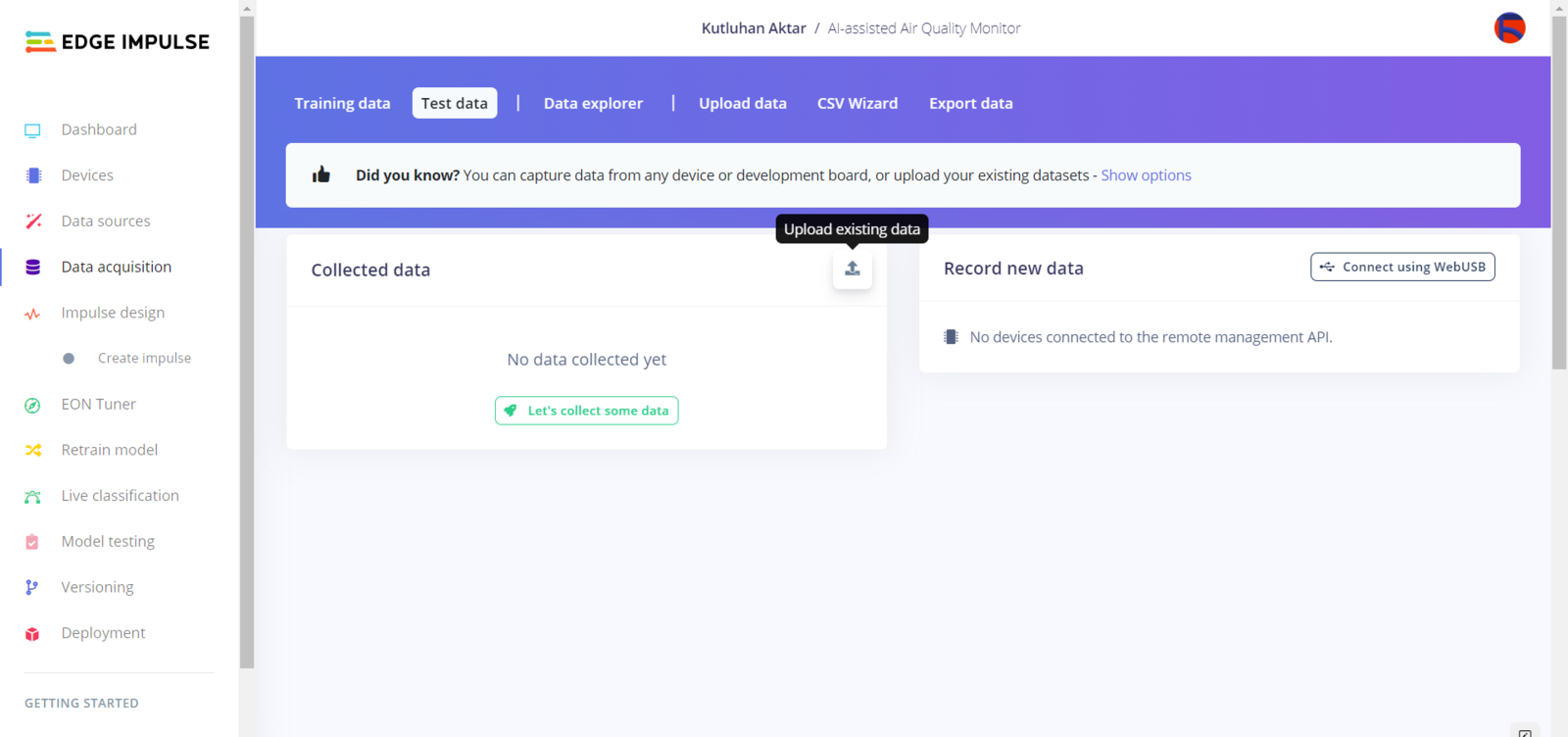 After generating training and testing samples successfully, I uploaded them to my project on Edge Impulse. :hash: First of all, sign up for Edge Impulse and create a new project.