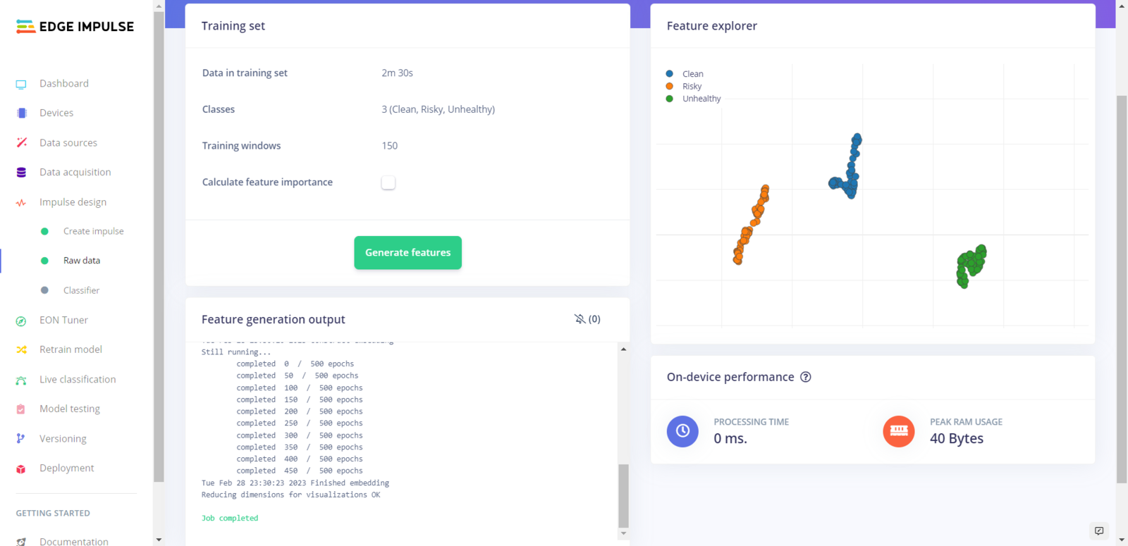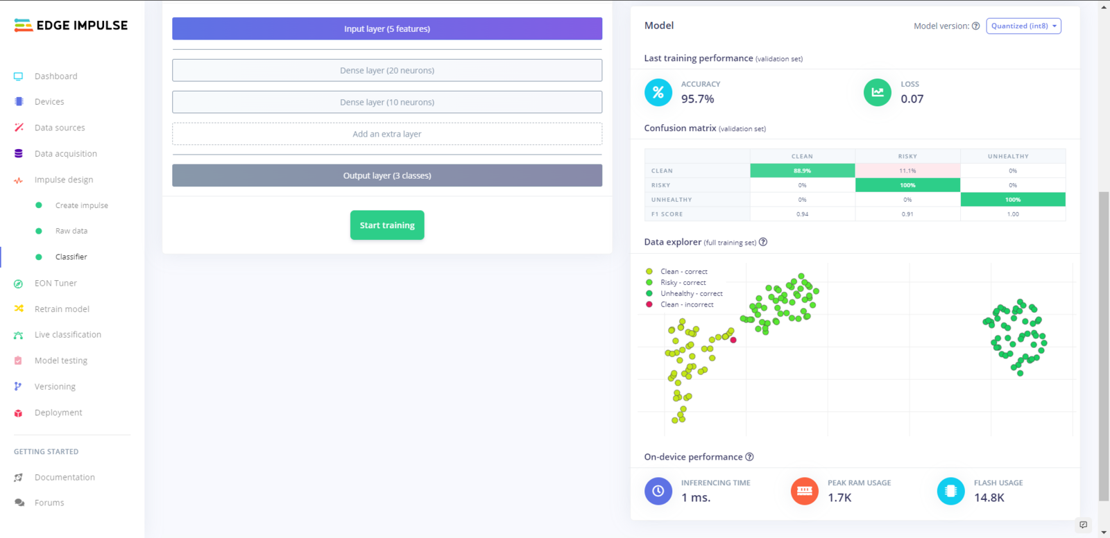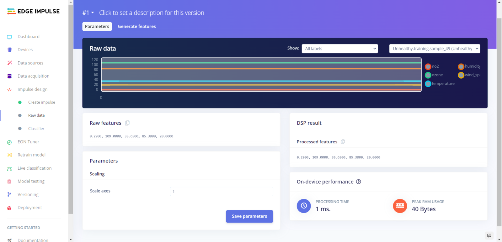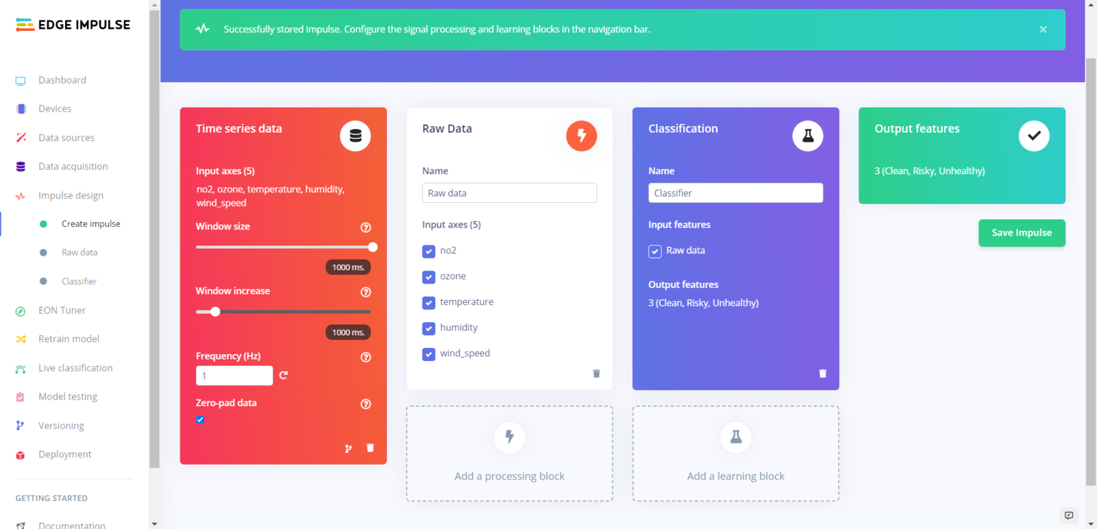 After uploading my training and testing samples successfully, I designed an impulse and trained it on air pollution levels (classes). An impulse is a custom neural network model in Edge Impulse. I created my impulse by employing the Raw Data processing block and the Classification learning block. The Raw Data processing block generate windows from data samples without any specific signal processing. The Classification learning block represents a Keras neural network model. Also, it lets the user change the model settings, architecture, and layers. :hash: Go to the Create impulse page. Then, select the Raw Data processing block and the Classification learning block. Finally, click Save Impulse.
