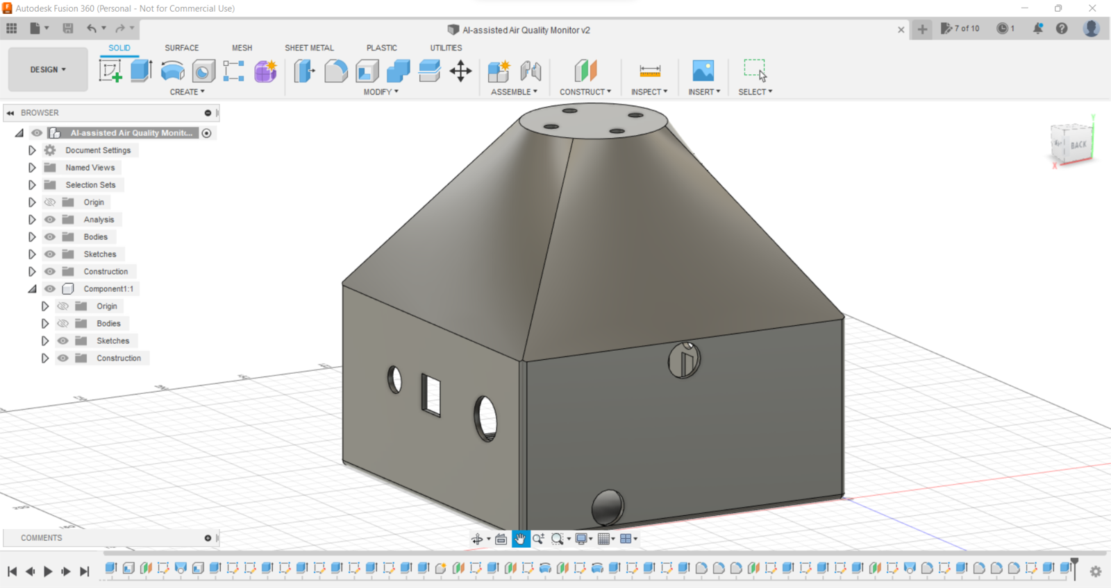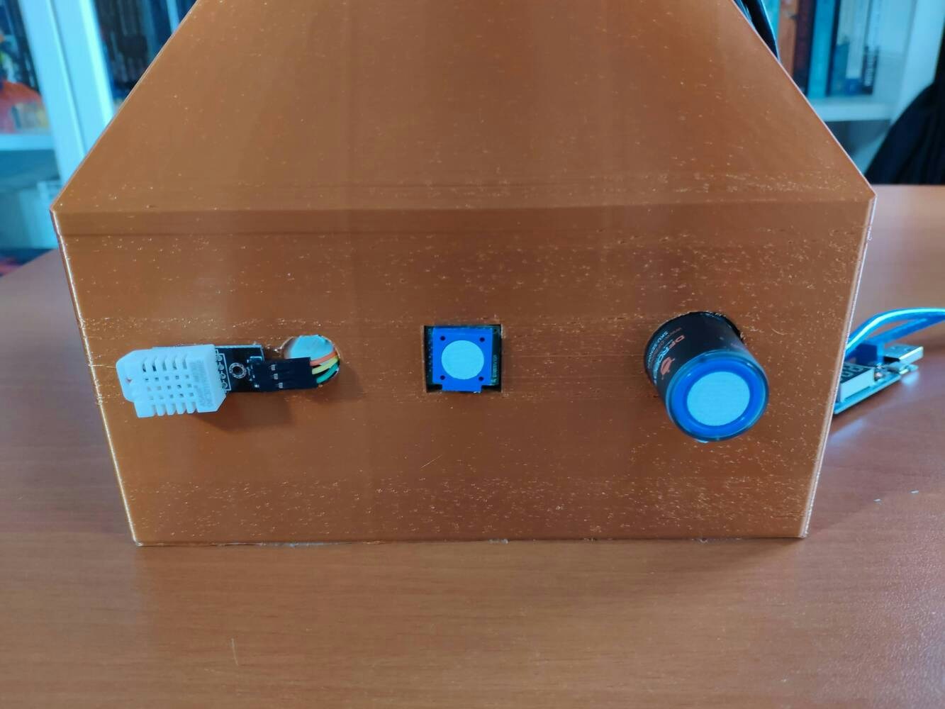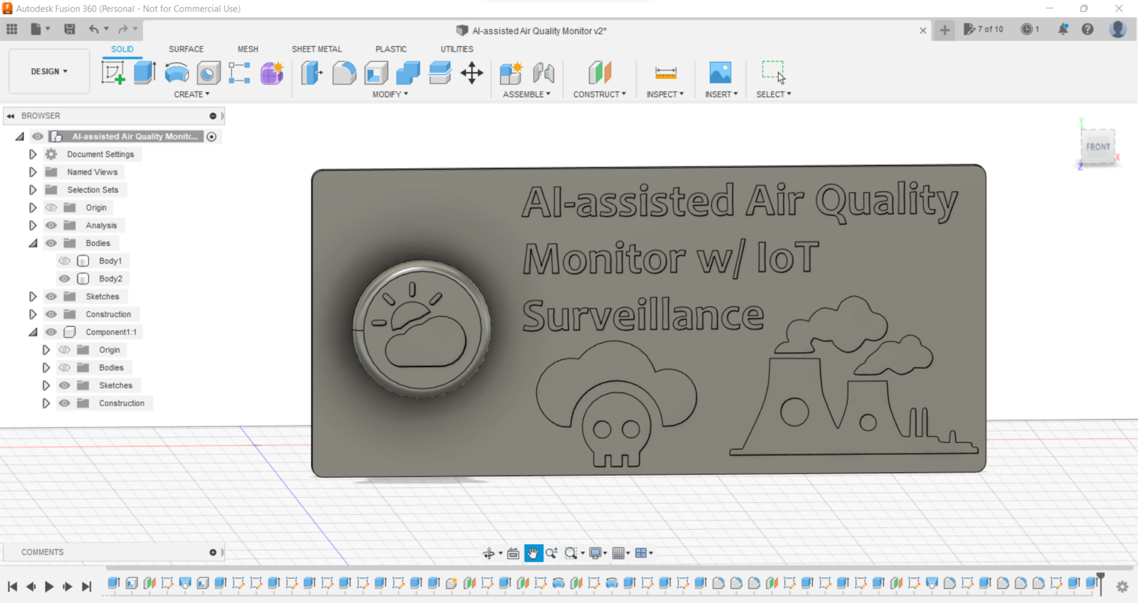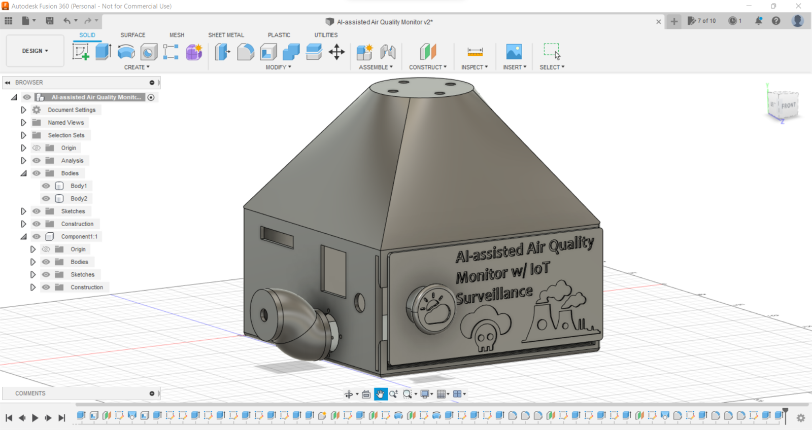 Since I focused on building a budget-friendly and accessible air station that collects air quality data and runs a neural network model to inform the user of air pollution via a PHP web application, I decided to design a sturdy and compact metallic case allowing the user to access the SD card after logging data, place the air quality sensors, and adjust the OV7725 camera effortlessly. To avoid overexposure to dust and prevent loose wire connections, I added a sliding front cover with a handle to the case. Then, I designed a separate camera holder mountable to the left side of the case at four different angles. Also, I decided to inscribe air pollution indicators on the sliding front cover to highlight the imminent pollution risk. Since I needed to attach an anemometer to the case to collect wind speed data, I decided to design a semi-convex structure for the case. This unique shape also serves as a wind deflector that protects the air quality sensors from potential wind damage. I designed the metallic air station case, its sliding front cover, and the mountable camera holder in Autodesk Fusion 360. You can download their STL files below.