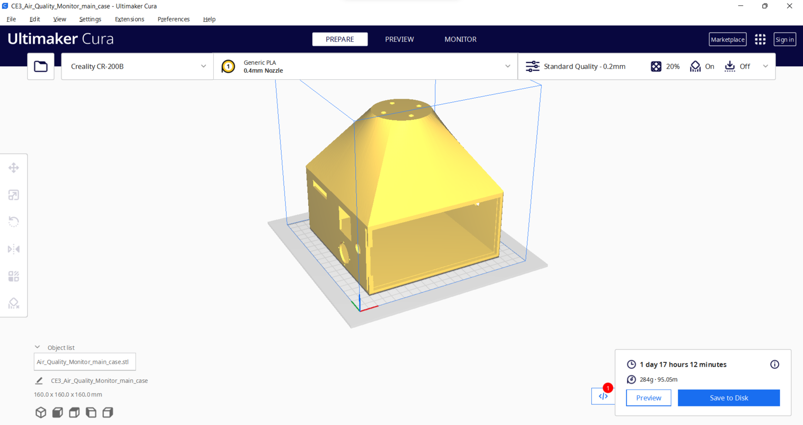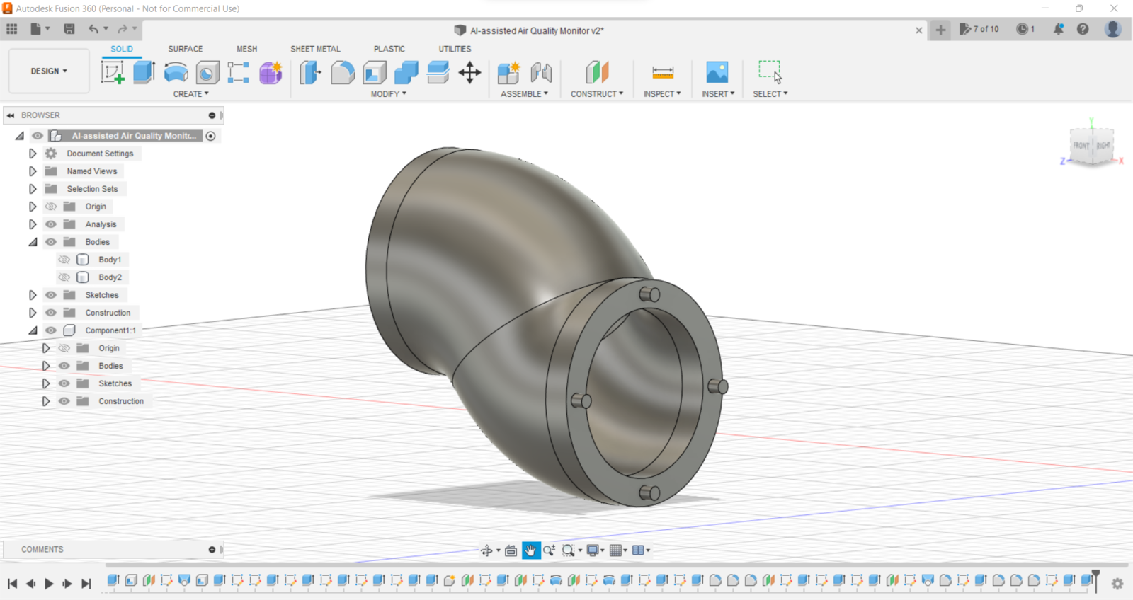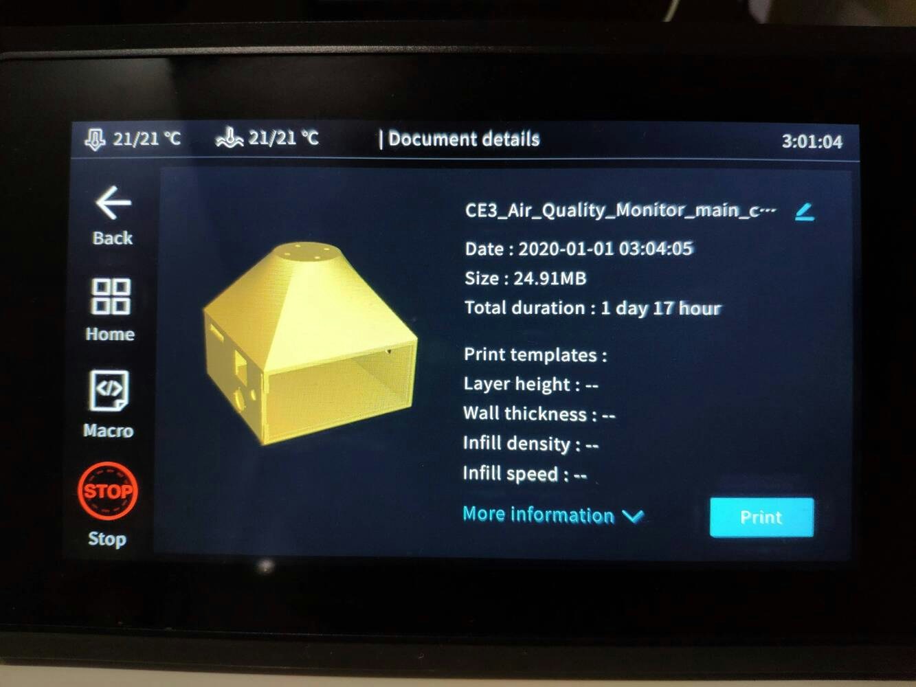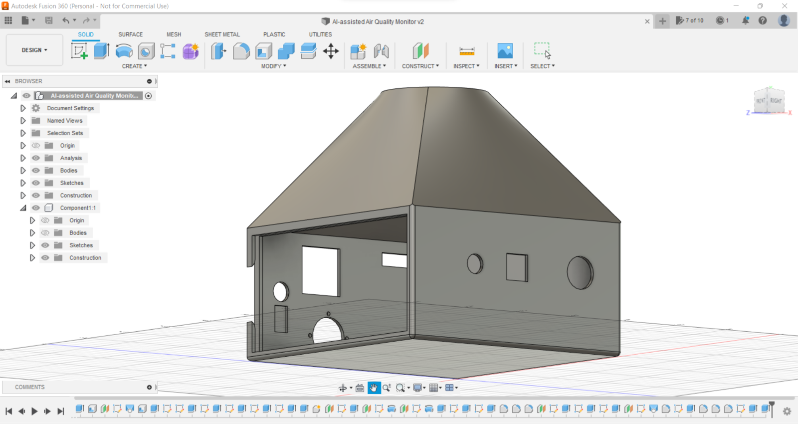 Since I focused on building a budget-friendly and accessible air station that collects air quality data and runs a neural network model to inform the user of air pollution via a PHP web application, I decided to design a sturdy and compact metallic case allowing the user to access the SD card after logging data, place the air quality sensors, and adjust the OV7725 camera effortlessly. To avoid overexposure to dust and prevent loose wire connections, I added a sliding front cover with a handle to the case. Then, I designed a separate camera holder mountable to the left side of the case at four different angles. Also, I decided to inscribe air pollution indicators on the sliding front cover to highlight the imminent pollution risk. Since I needed to attach an anemometer to the case to collect wind speed data, I decided to design a semi-convex structure for the case. This unique shape also serves as a wind deflector that protects the air quality sensors from potential wind damage. I designed the metallic air station case, its sliding front cover, and the mountable camera holder in Autodesk Fusion 360. You can download their STL files below.