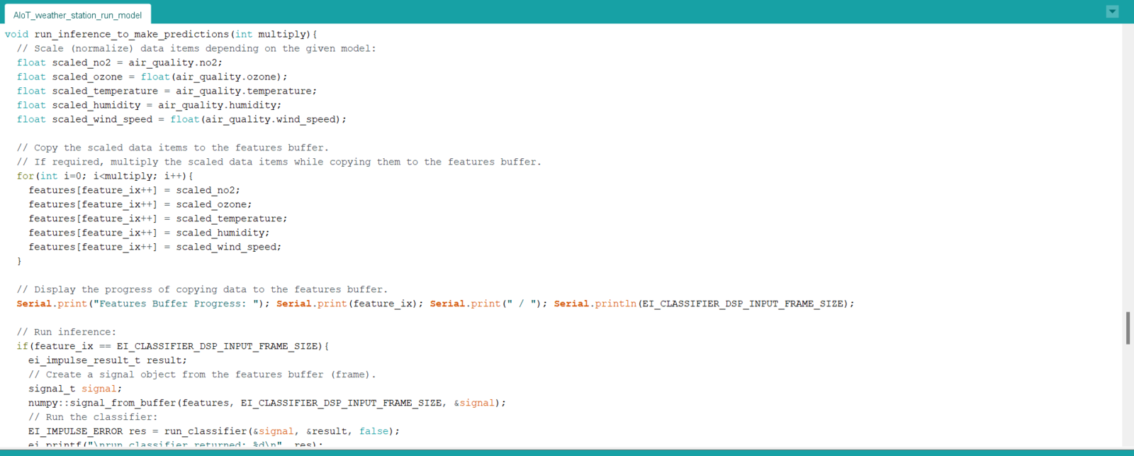 After building, training, and deploying my model as an Arduino library on Edge Impulse, I needed to upload the generated Arduino library on FireBeetle ESP32 to run the model directly so as to create an easy-to-use and capable air station operating with minimal latency, memory usage, and power consumption. Since Edge Impulse optimizes and formats signal processing, configuration, and learning blocks into a single package while deploying models as Arduino libraries, I was able to import my model effortlessly to run inferences. :hash: After downloading the model as an Arduino library in the ZIP file format, go to Sketch ➡ Include Library ➡ Add .ZIP Library… :hash: Then, include the AI-assisted_Air_Quality_Monitor_inferencing.h file to import the Edge Impulse neural network model.- User Button (Built-in) ➡ Run Inference
