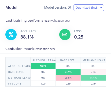 A great way of going about testing our model is to navigate to the Model Testing tab. You will be presented with the samples stored in the Testing data pool. Click on Classify all to run all this data through your Impulse. The Model testing tab provides the user the ability to test out and optimize the model before going through the effort of deploying it back on the edge. The possibility of going back and adding Training data, tweaking the DSP and Learning block, and fine-tuning the model shaves off an enormous amount of development time when creating an edge computing application.Deploying the Model as Arduino Library