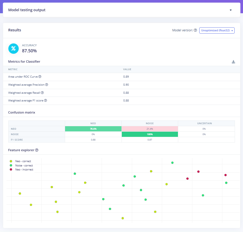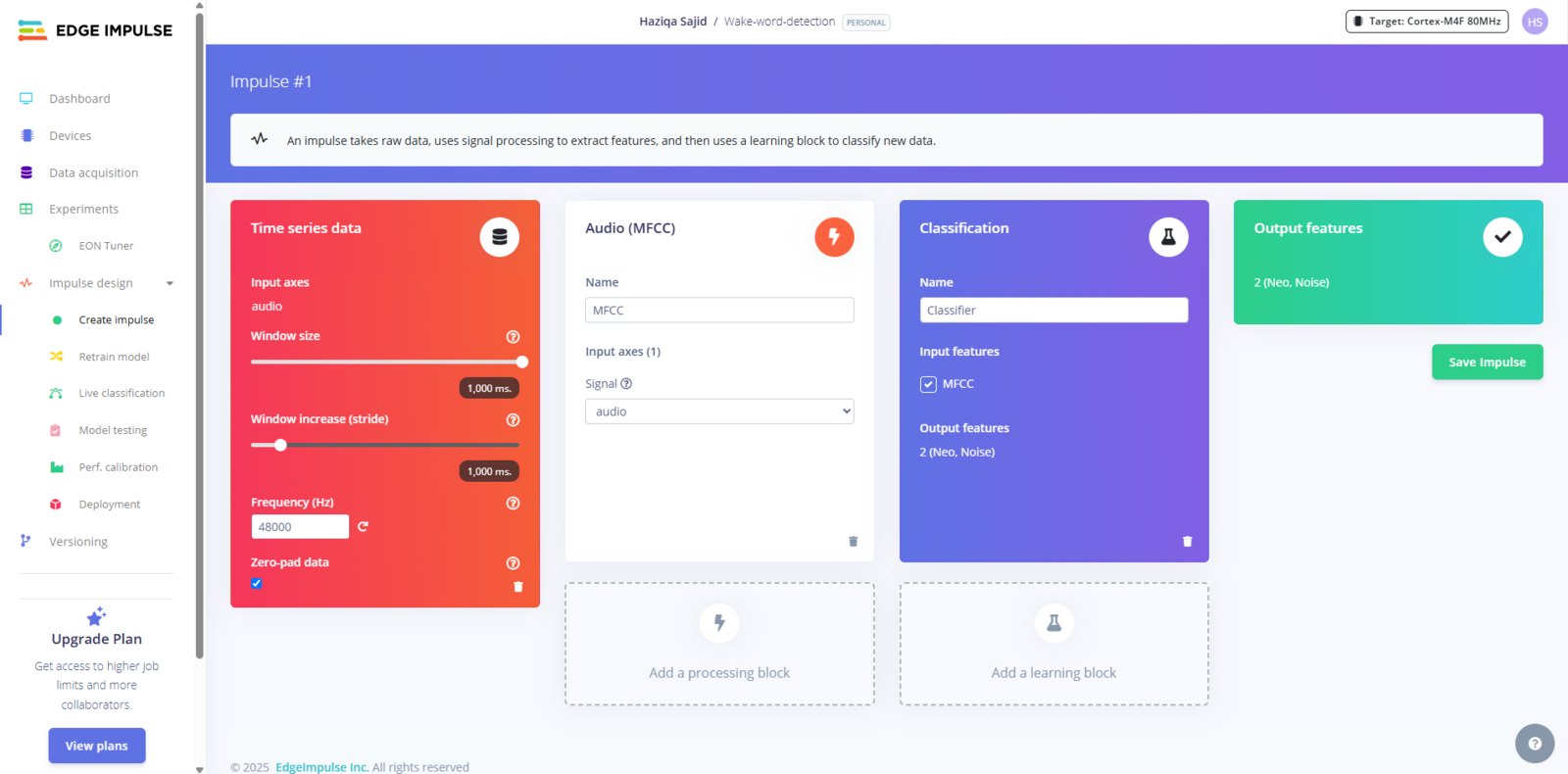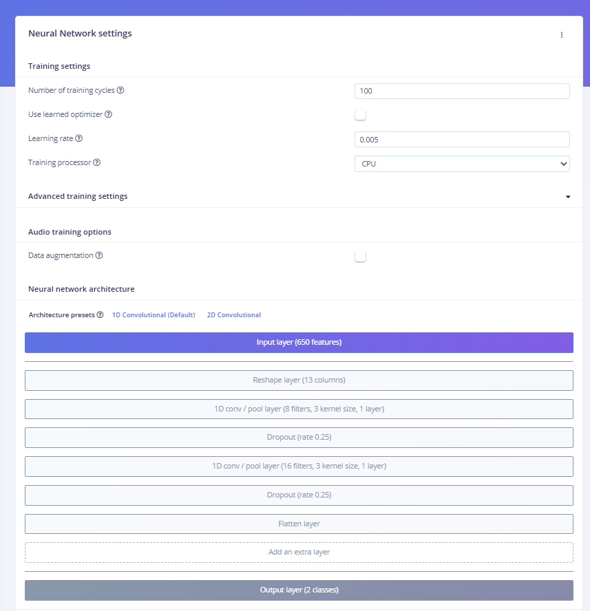 Under the Impulse design tab, drag in an MFCC audio processing block, then a Neural Network block. In our project, here’s how we configured the audio preprocessing: