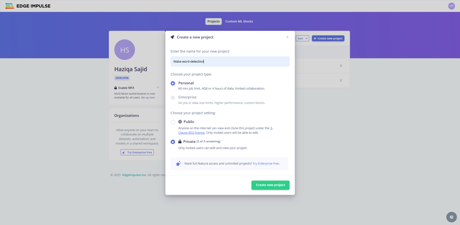 First, you need a few tools before you can start building. Head over to Edge Impulse and create a free account. Once you’re in, start a new project: