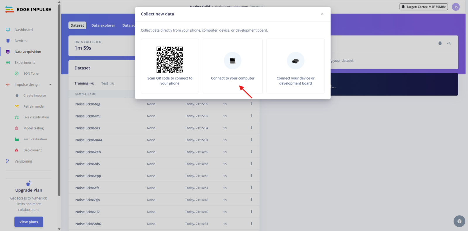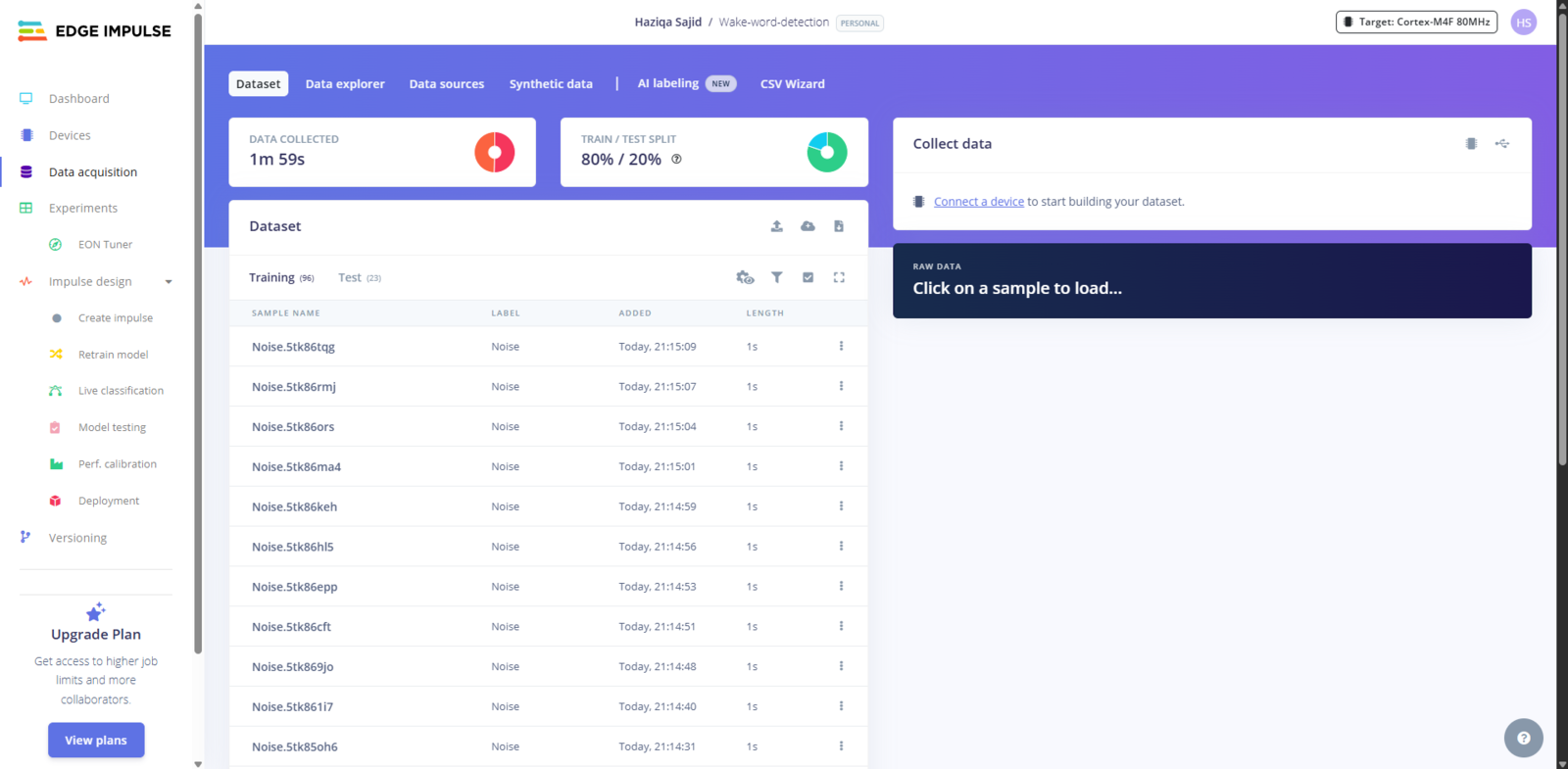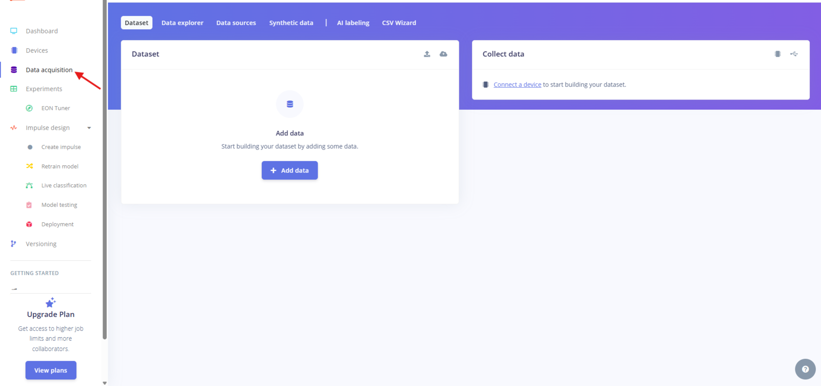 The very first step in any machine learning project is collecting data, and Edge Impulse makes this part surprisingly smooth. In the left-hand menu, click on Data Acquisition to get started.