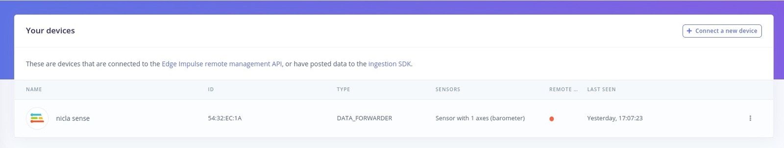 This will launch a wizard that will prompt you to log in and select an Edge Impulse project. You will also have to name the device and the axes of your sensor (in this case our only axis is barometer). You should now see Nicla Sense in the Devices menu on Edge Impulse.