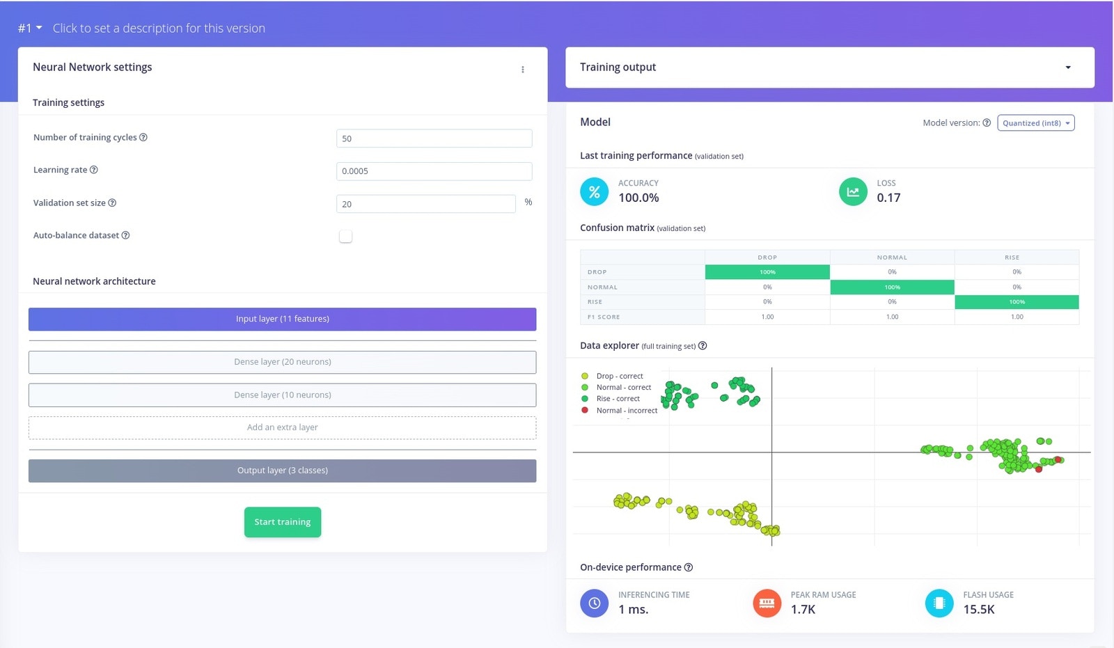 Now go to NN Classifier and start training the model. At the end of the training you’ll see the accuracy and the loss of the model. A good performing model will have a high accuracy and a low loss. In the beginning, you can use the default training settings and adjust them later if you are not satisfied with the performance results.