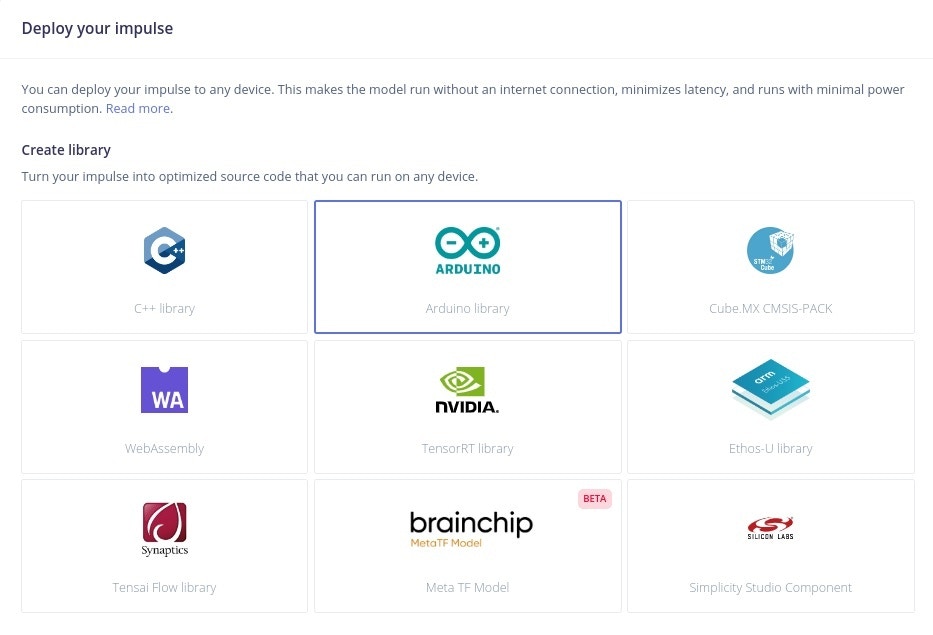 Finally, go to Deployment and export the trained model as an Arduino library.