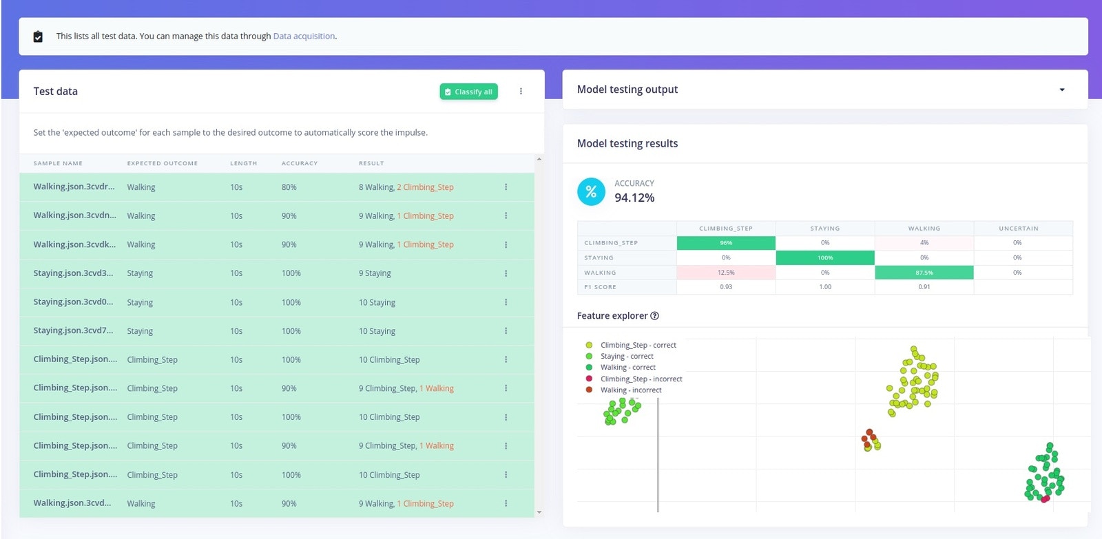 Finally, go to Model testing and click on Classify All to check how your model performs on new data.