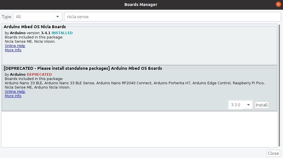 In order to use the Edge Impulse platform, you will need to create an account. Once you have done so, log in and click on the “New Project” button. Enter a name for it, then select “Create Project”. You should now be redirected to the project main page. Here, you will be able to configure the settings for your project, as well as add and train machine learning models. The first step when designing a Machine Learning model is data collection, and Edge Impulse provides a straightforward method of doing this through their Data Forwarder, which can collect data from the device over a serial connection and send it to the Edge Impulse platform through their ingestion service. To use the Data Forwarder, install the Edge Impulse CLI following the steps from here. To get started, you’ll need to connect the Nicla Sense ME to your computer using a micro USB cable. Once it’s connected, open up the Arduino IDE and go to the Board Manager (under Tools > Board) to install the board support package (Arduino Mbed OS Nicla Boards).