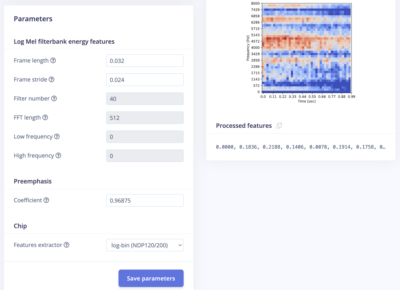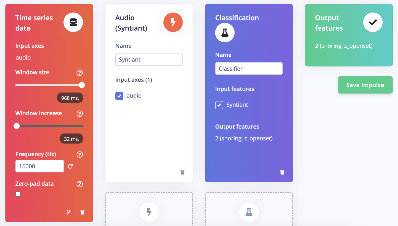 Go to the Impulse Design > Create Impulse page and click on the Add a processing block and choose Audio (Syntiant) which computes log Mel-filterbank energy features from an audio signal specific to the Syntiant audio front-end. Also, on the same page click on the Add a learning block and choose Classification which learns patterns from data, and can apply these to new data. We opted for a default window size of 968 ms and a window increase of 32 ms, which allows for two complete frames within a second of the sample. Now click on the Save Impulse button.