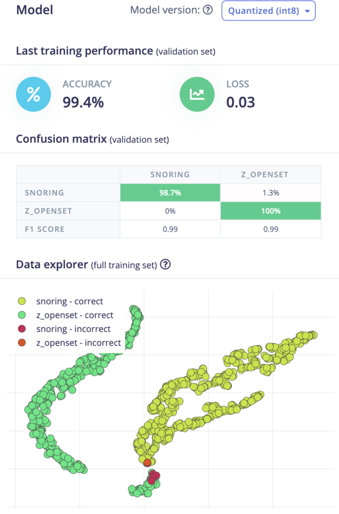 To assess the model’s performance on the test datasets, navigate to the Model testing page and select the Classify all button. We can be confident in the model’s effectiveness on new, unseen data, with an accuracy rate of 94.62%.