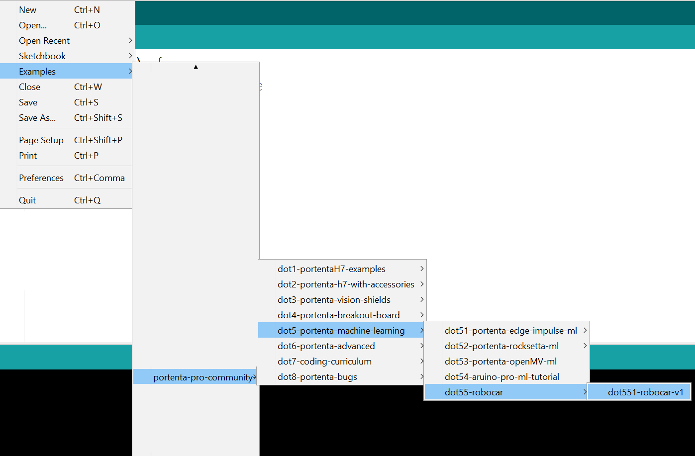 Download the Arduino Sketch named dot551-robocar-v1.ino. Loading it is easy from the Arduino IDE if you have installed the “Portenta Pro Community Solutions” library as it will also load the included file#include "edge-impulse-advanced-v2.h". If you want you can manually load that included file from: edge-impulse-advanced-v2.h. It is just a way to get rid of the complex coding, so your main file only has the necessary code that you might want to change.